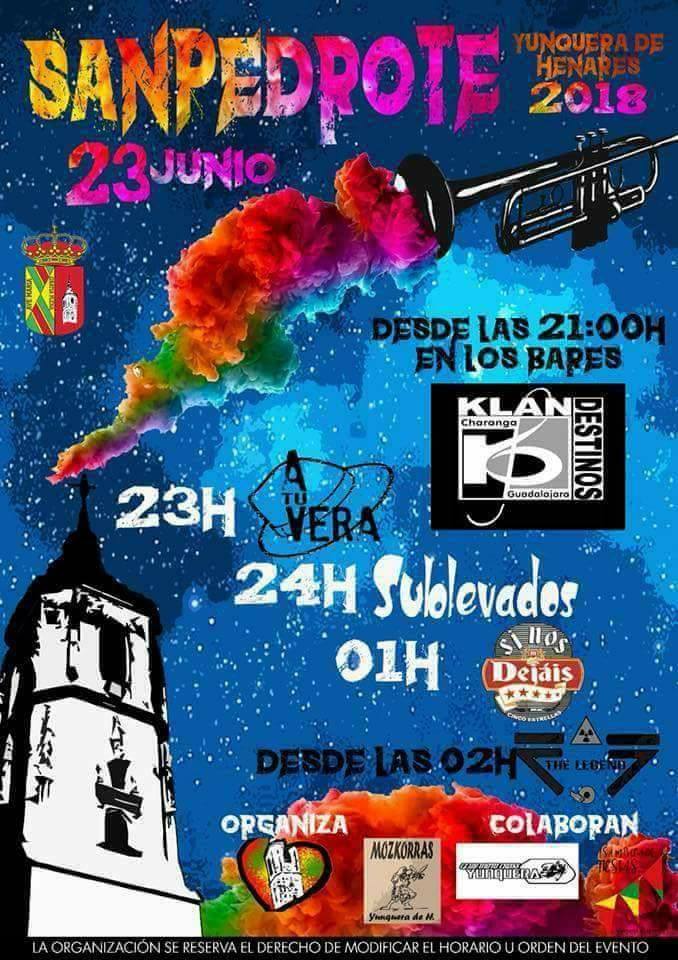 El sábado 23 a partir de las 21:00 horas, arranca SAMPEDROTE-2018 con la fantástica Charanga KLANDESTINOS, en la plaza de la Casilla, después sobre las 23:00 horas en la zona de bares música de cuerda y electrónica hasta bién entrada la madrugada con: A TU VERA, SUBLEVADOS, SI NOS DEJÁIS y THE LEGEND