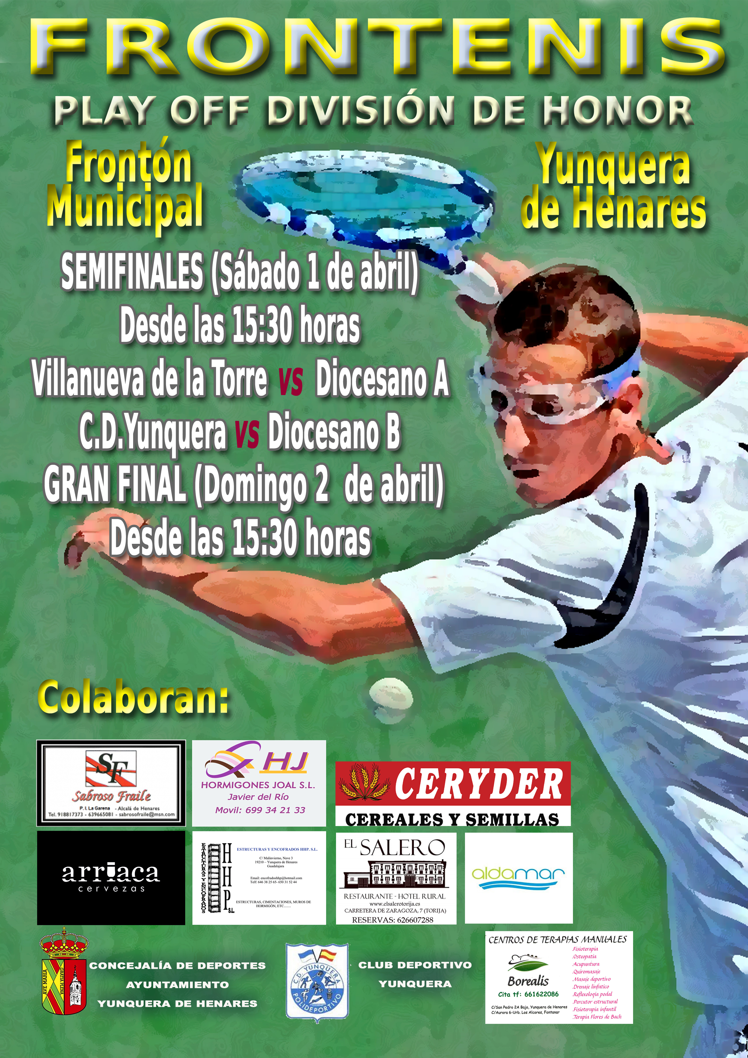 Colaboran: Ayuntamiento de Yunquera de Henares, Electrodomésticos Olías, Mesón el Rodeo, Pollería Kiriko, Cervezas Arriaca, Bar Ricote y Cafetería Taracena.