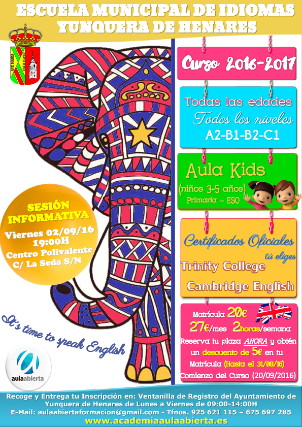 La escuela de idiomas Aula Abierta, que imparte sus clases de inglés en Yunquera de Henares en colaboración con la Concejalía de Educación, organiza una sesión informativa para hablar del próximo Curso 2016-2017, que tendrá lugar el viernes, día 2 de septiembre, en el Centro Social Polivalente (C/.…