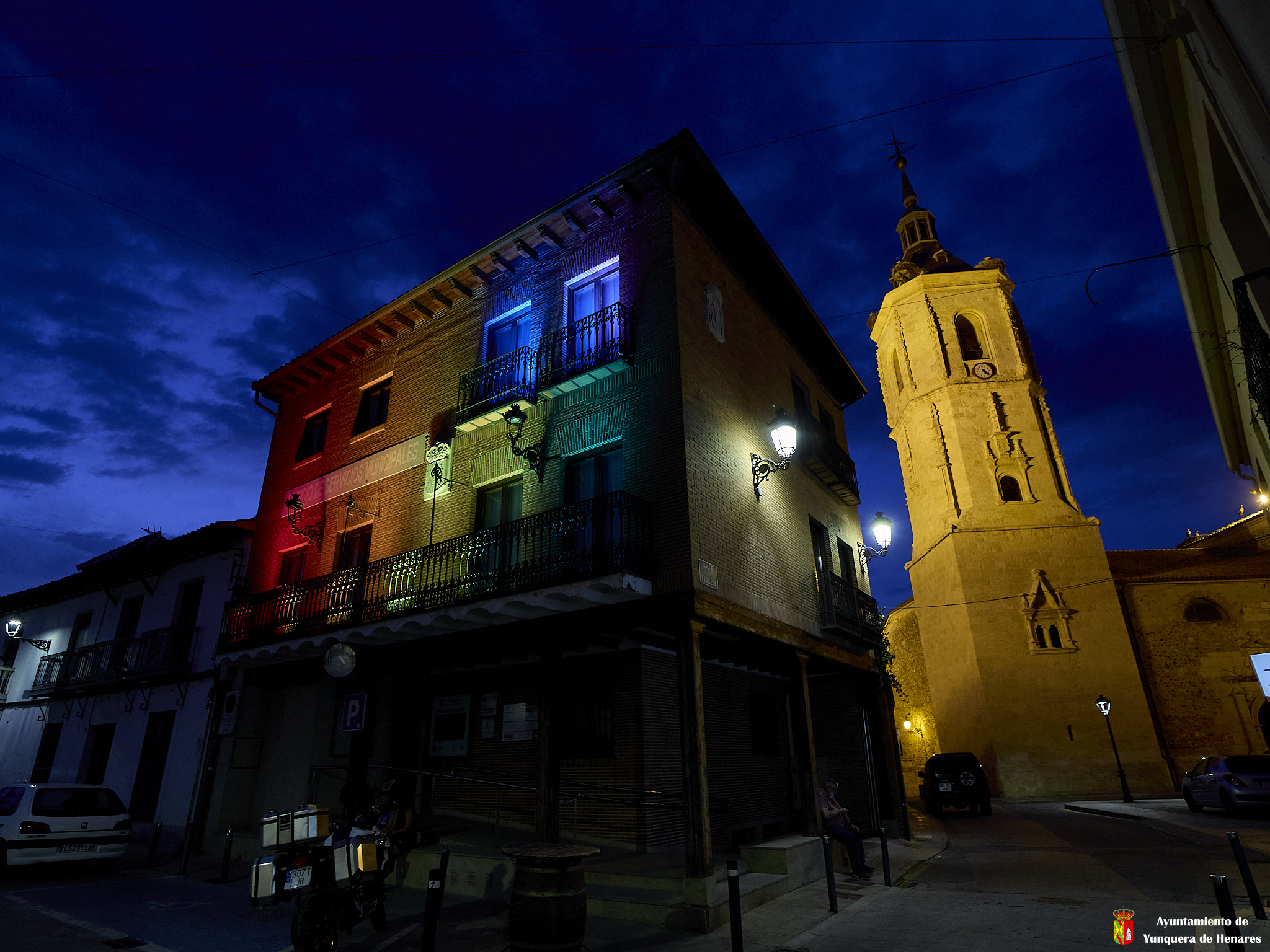 El Edificio Municipal de Usos M煤ltiples de Yunquera de Henares luce los colores de la bandera arco铆ris con motivo del D铆a Internacional del Orgullo LGTBI.