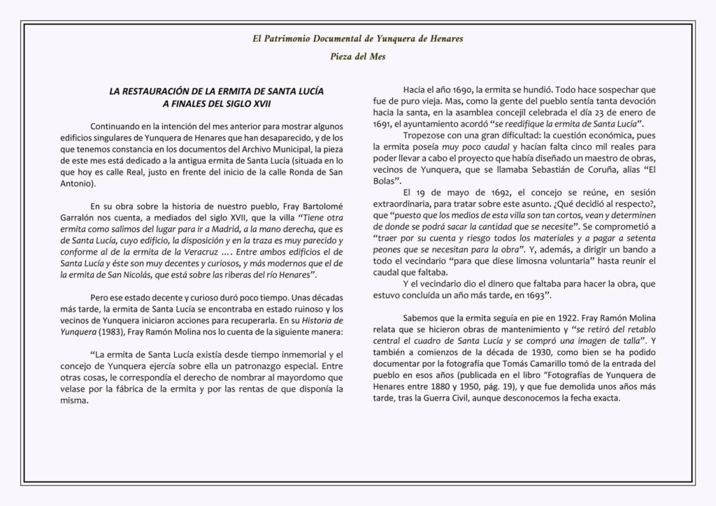 Ya pod茅is encontrar en la Biblioteca Municipal una nueva entrega de 芦La Pieza del Mes禄, esta vez dedicada a la restauraci贸n de la antigua ermita de Santa Luc铆a a finales del Siglo XVII.