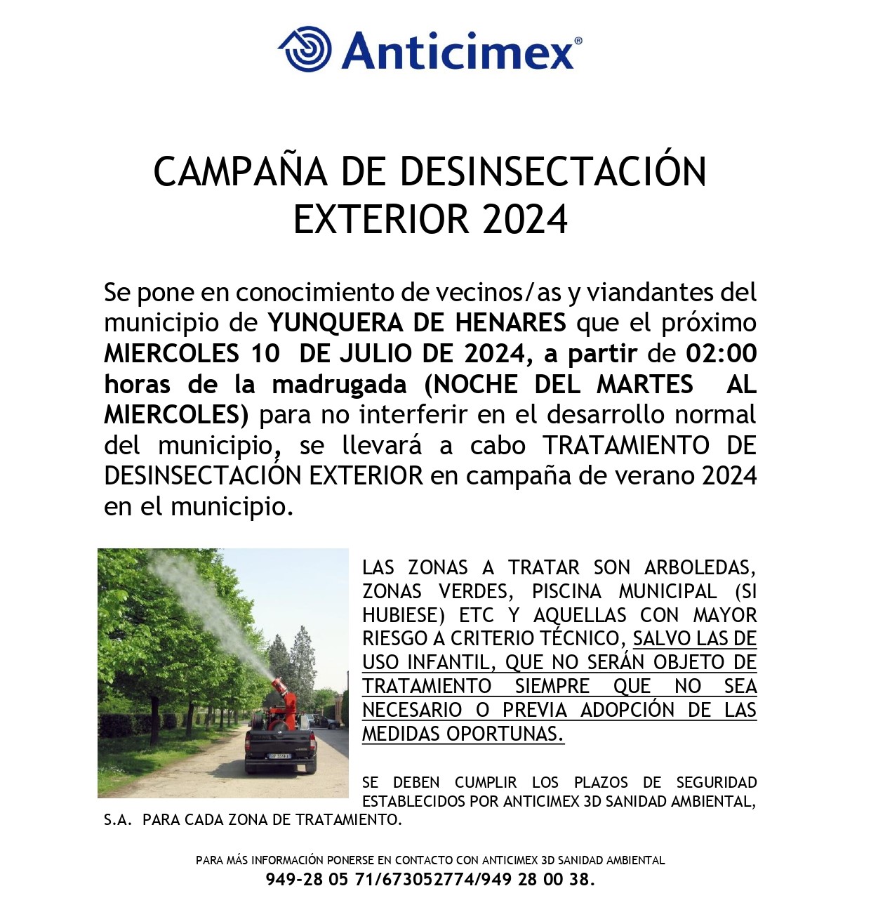 Este mi茅rcoles 10 de julio a partir de las 2.00 horas ( noche del martes al mi茅rcoles) volver谩n los trabajos de desinsectaci贸n exterior a Yunquera de Henares.