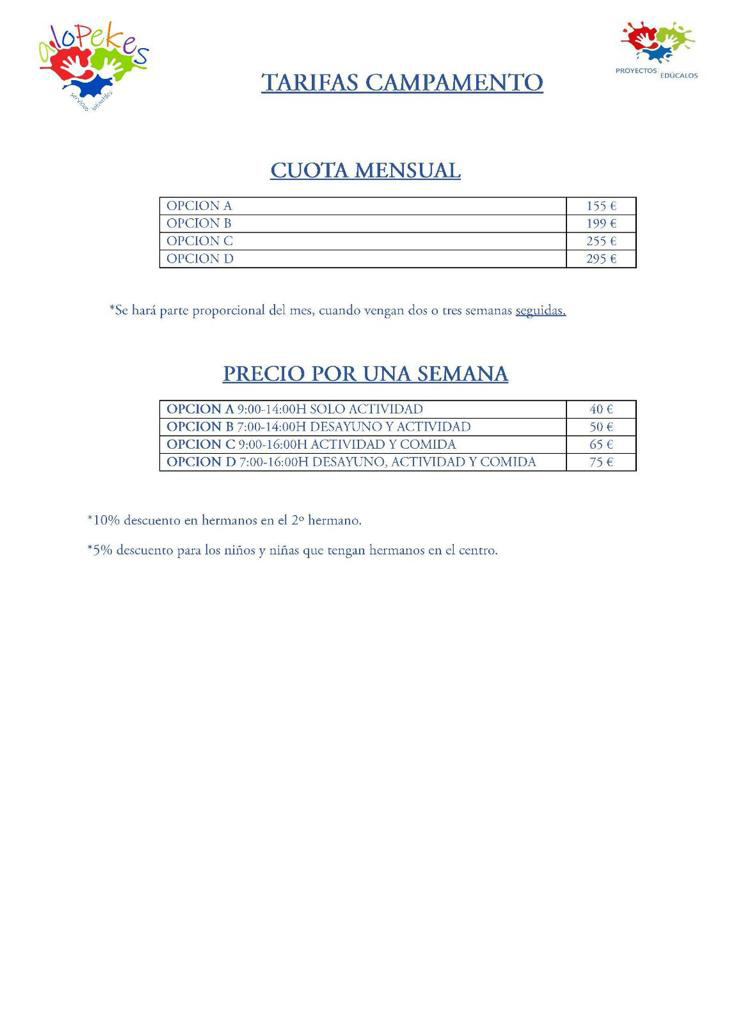 Tarifas Campamento: