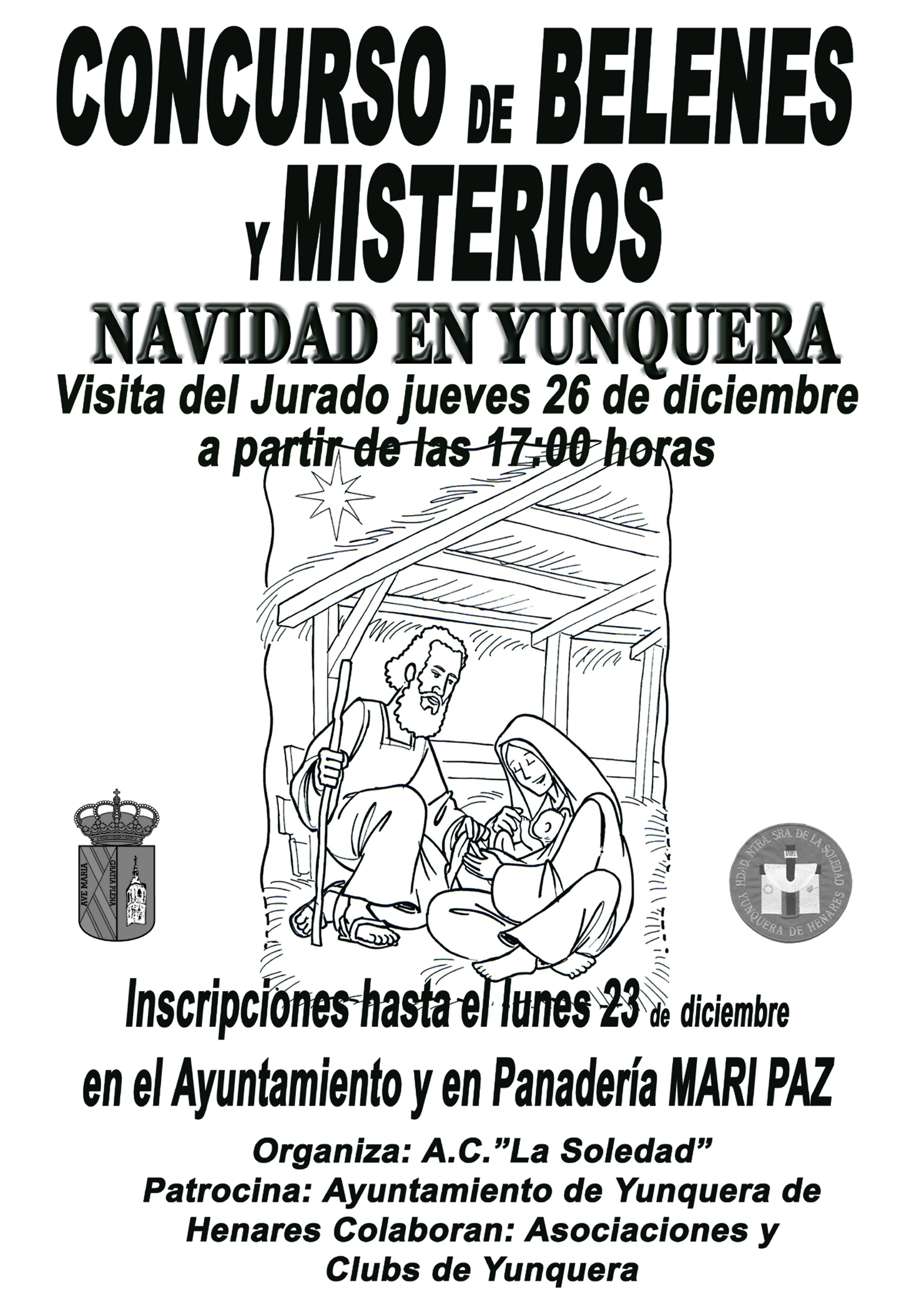 Un año más la Asociación Cultural “La Soledad” de Yunquera de Henares organiza el concurso de belenes y misterios encuadrado dentro de la programación navideña y para ello cuenta con el patrocinio del Ayuntamiento campiñero y la colaboración de las distintas asociaciones y clubes de la localidad.Los interesados en participar deberán formalizar su inscripción en las oficinas del Ayuntamiento en horario de 9 a 14 o bien en la Panadería Mari Paz, también de 9 a 14 horas, hasta el día 23 de diciembre, fecha en la que finalizará el plazo de inscripciones.