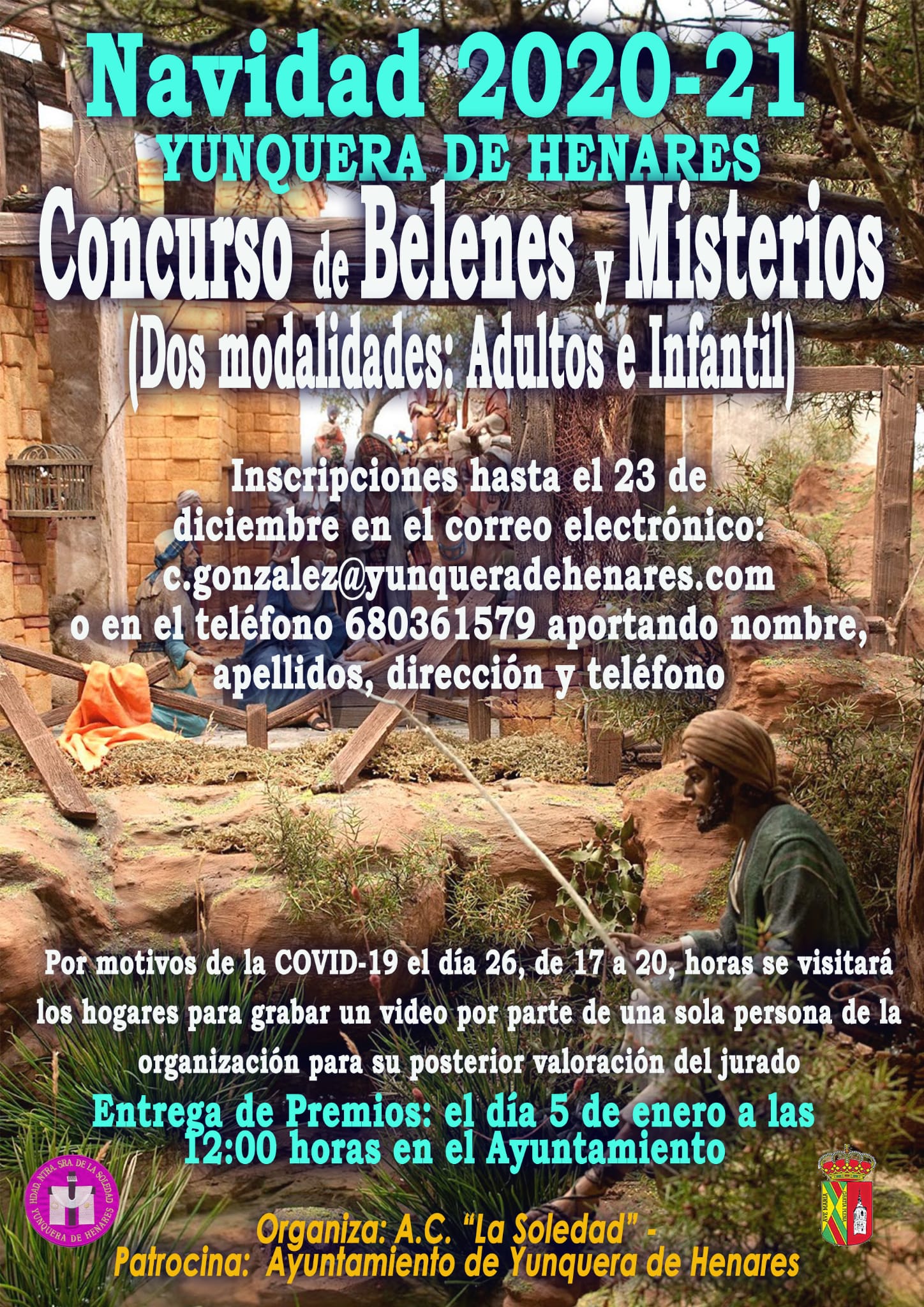 Por su parte, el Concurso de Belenes y Misterios está organizado por la Asociación Cultural ‘La Soledad’, con el patrocinio del Consistorio. Los interesados tienen hasta el próximo 23 de diciembre para inscribirse. Para garantizar en todo momento el seguimiento de los protocolos sanitarios, el 26 de diciembre, de 17.00 a 20.00 horas, se realizarán las visitas a las viviendas de los participantes, donde una persona grabará un vídeo del Belén o Misterio para su posterior valoración por parte del jurado. Una vez decididos los ganadores, la entrega de premios se realizará el 5 de enero a las 12.00 horas, en las dependencias del Ayuntamiento de Yunquera de Henares.