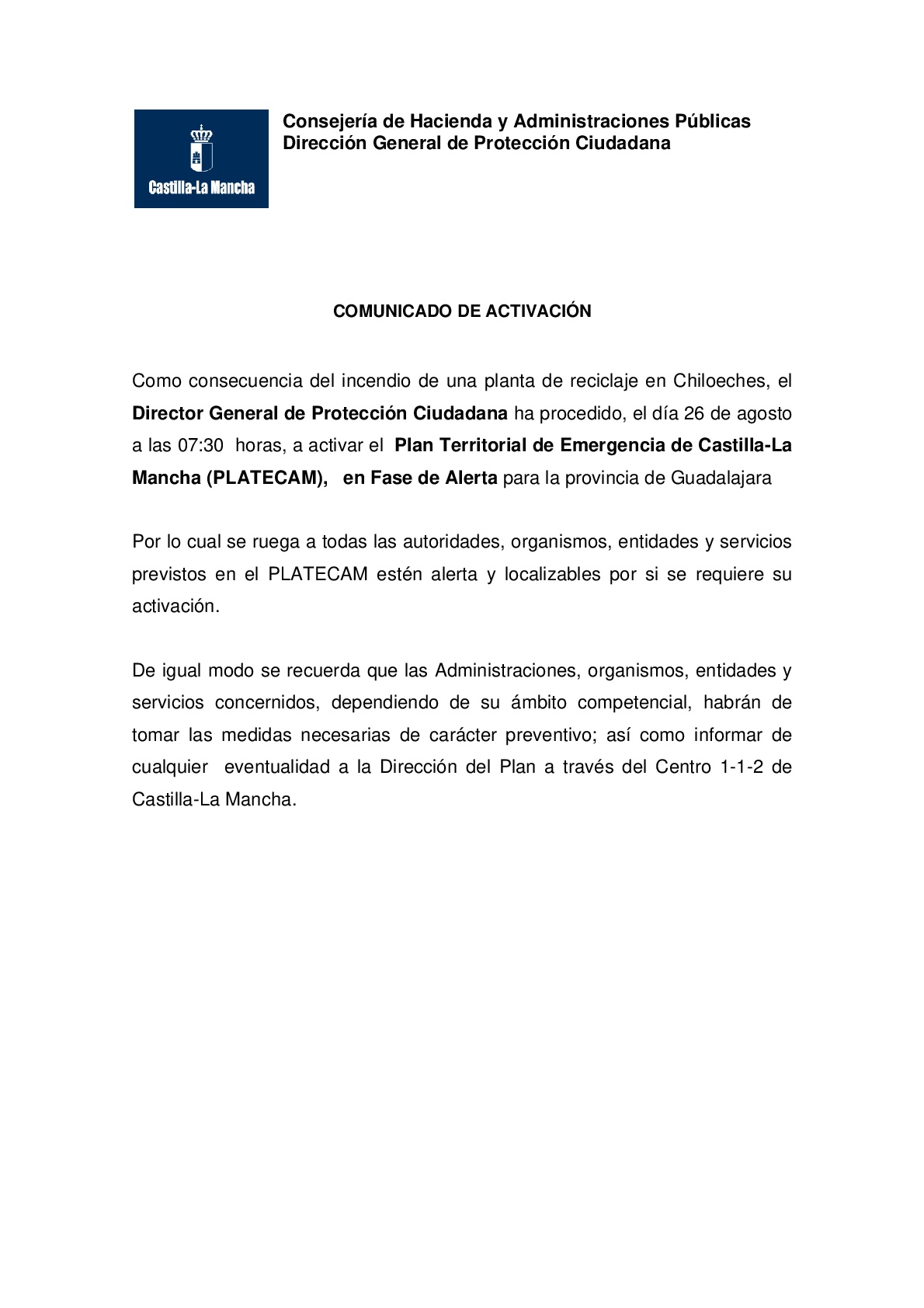 Como consecuencia del incendio de la planta de reciclaje de Chiloeches, se ha activado el PLATECAM en fase de alerta. Os seguiremos informando.