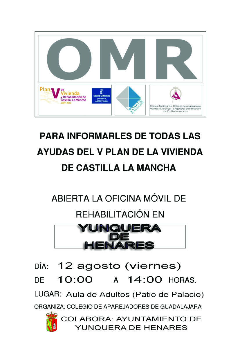 El próximo viernes, 12 de agosto, entre las 10 y las 14 horas visitará el Aula de Adultos de Yunquera de Henares, situada en el Palacio de los Mendoza, una Oficina Móvil de Rehabilitación (OMR).…