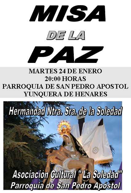 El próximo martes, 24 de enero, a partir de las 20:00 horas, tendrá lugar en la parroquia de San Pedro Apóstol de Yunquera de Henares, la tradicional misa del día de La Paz.