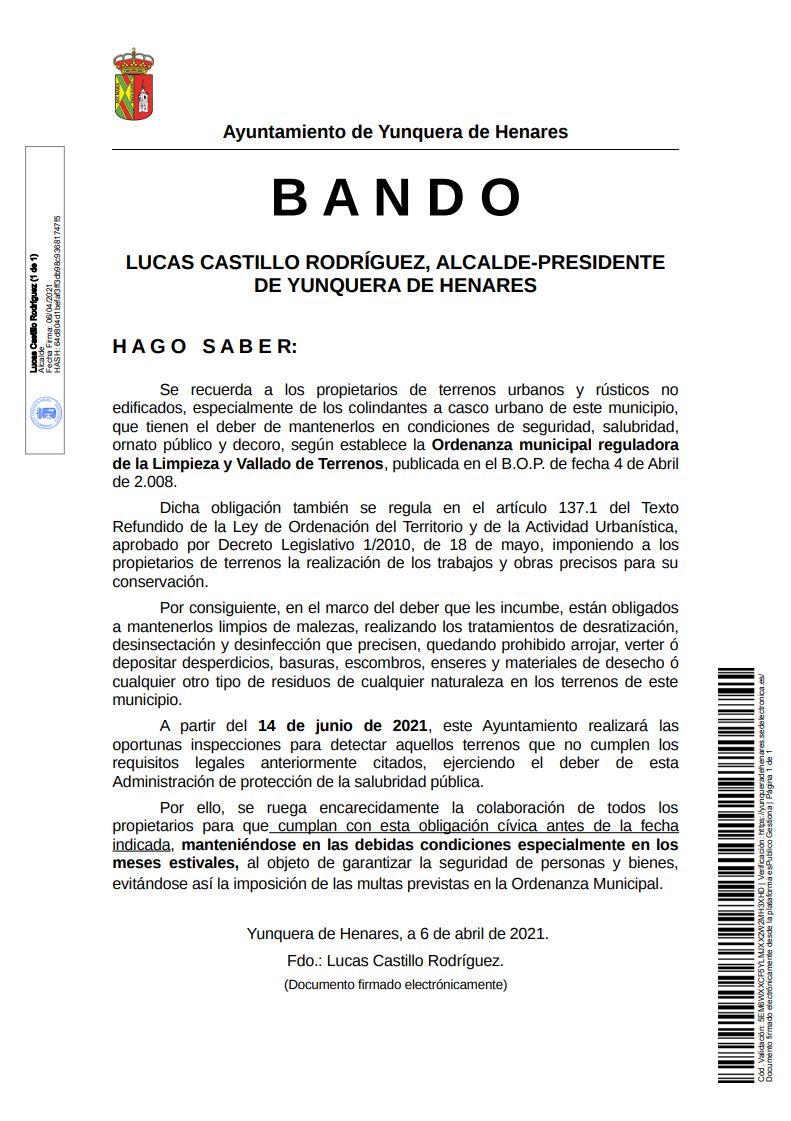 Home » Noticias • Sin categoría » Bando sobre la obligación de mantener limpios los solares de Yunquera de Henares