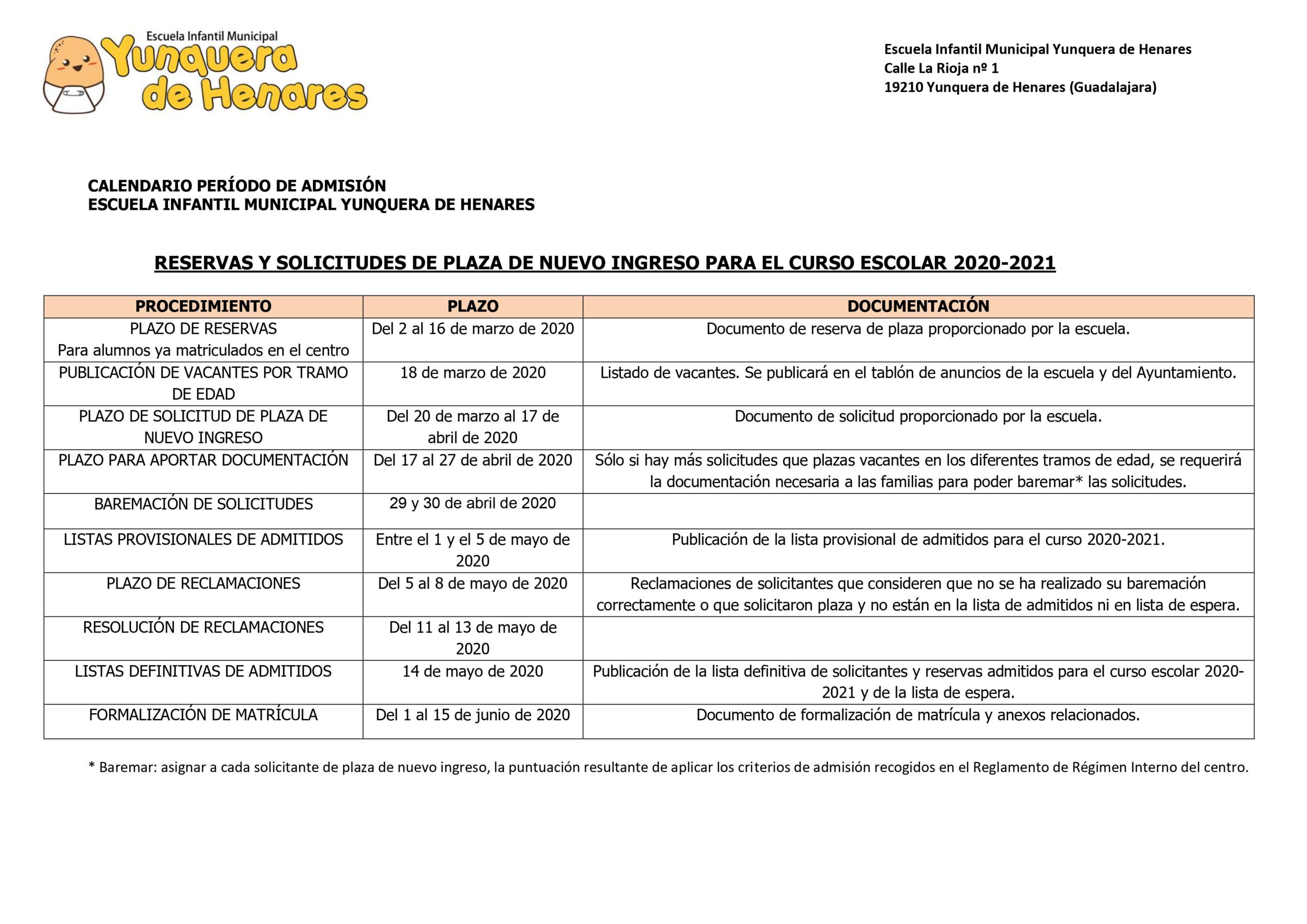 Calendario Periodo de Admisión, Escuela Infantil Municipal