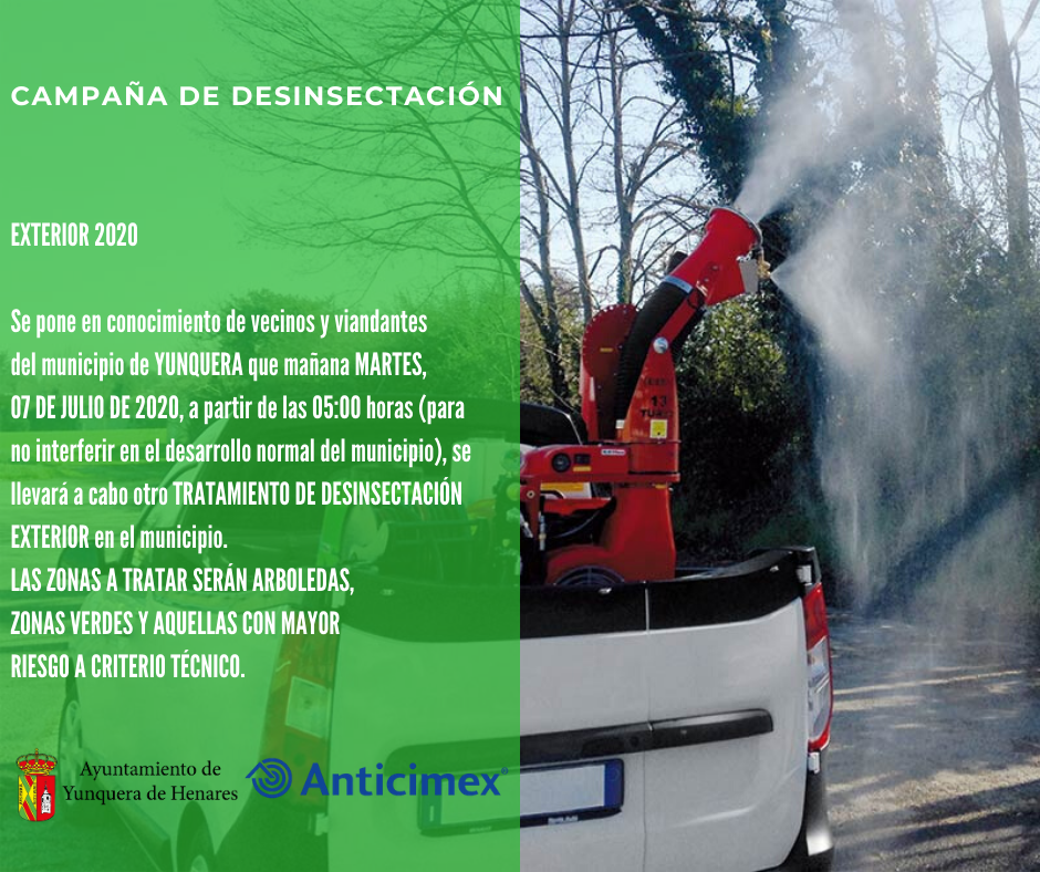 Se pone en conocimiento de los vecinos que hoy martes, 07 DE JULIO DE 2020, a partir de las 05:00 horas (para no interferir en el desarrollo normal del municipio), se llevará a cabo un tratamiento de desinsectación que se une a los ya acometidos en el exterior en el municipio.