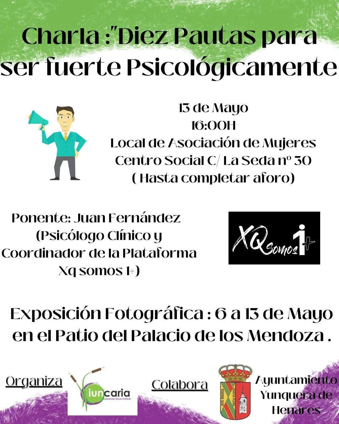 El próximo lunes a las 16:00 horas en el Centro Social Polivalente, la asociación socio-cultural Iuncaria organiza una interesante charla de la mano del psicólogo clínico y coordinador de la plataforma XQsomos1+ Juan Fernández, el cual hablará sobre pautas mentales para tener una buena y fuerte salud mental.