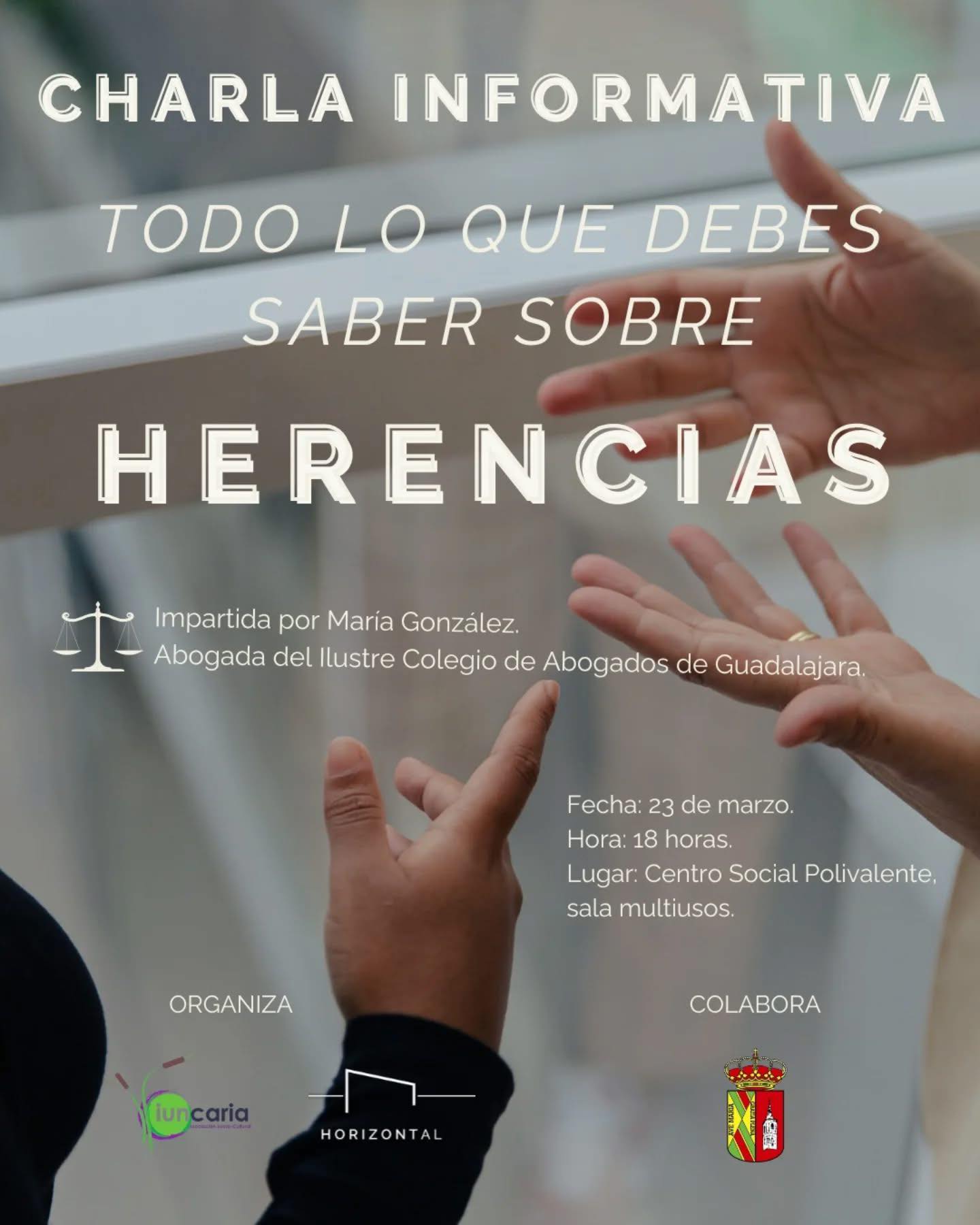 Este domingo 23 de marzo tendr谩 lugar una charla impartida por Mar铆a Gonz谩lez, abogada del Ilustre Colegio de Abogados de Guadalajara, sobre conceptos y aspectos pr谩cticos esenciales que todos deber铆amos conocer sobre herencias.
