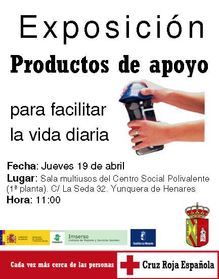 Cruz Roja ofrecerá el próximo jueves 19 de abril, a partir de las 11:00 horas, en la Sala Multiusos del Centro Social Polivalente de Yunquera de Henares (calle La Seda, 32, 1ª planta); una charla sobre una amplia gama de productos de apoyo que posee la organización y que permiten realizar tareas comunes de forma más sencilla, con menos esfuerzo y de manera más efectiva: en el trabajo, en el tiempo libre, a la hora de la alimentación, en los desplazamientos, etc.