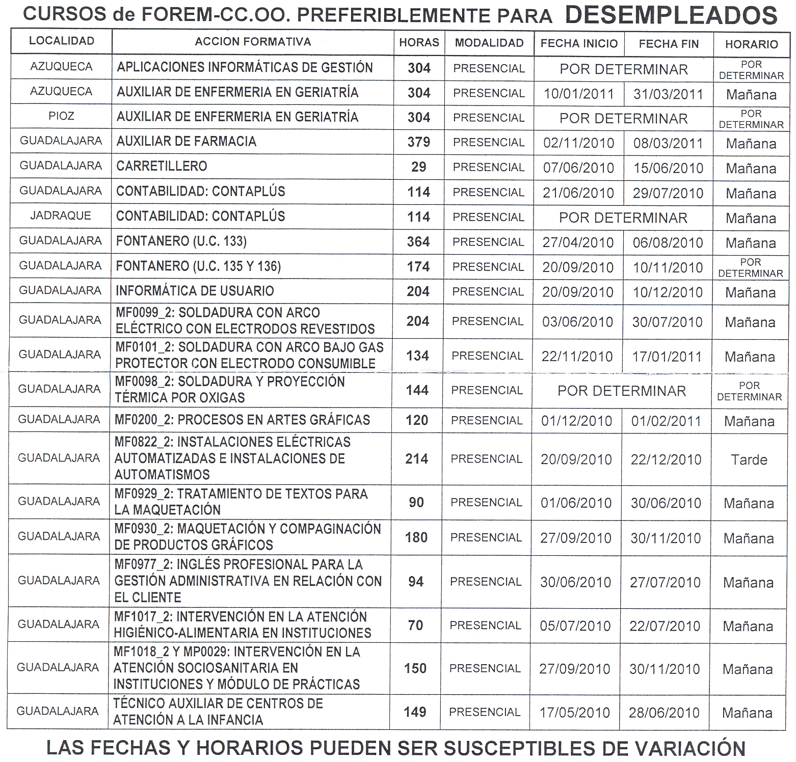 CURSOS PREFERIBLEMENTE PARA DESEMPLEADOS OFERTADOS POR CC.OO.