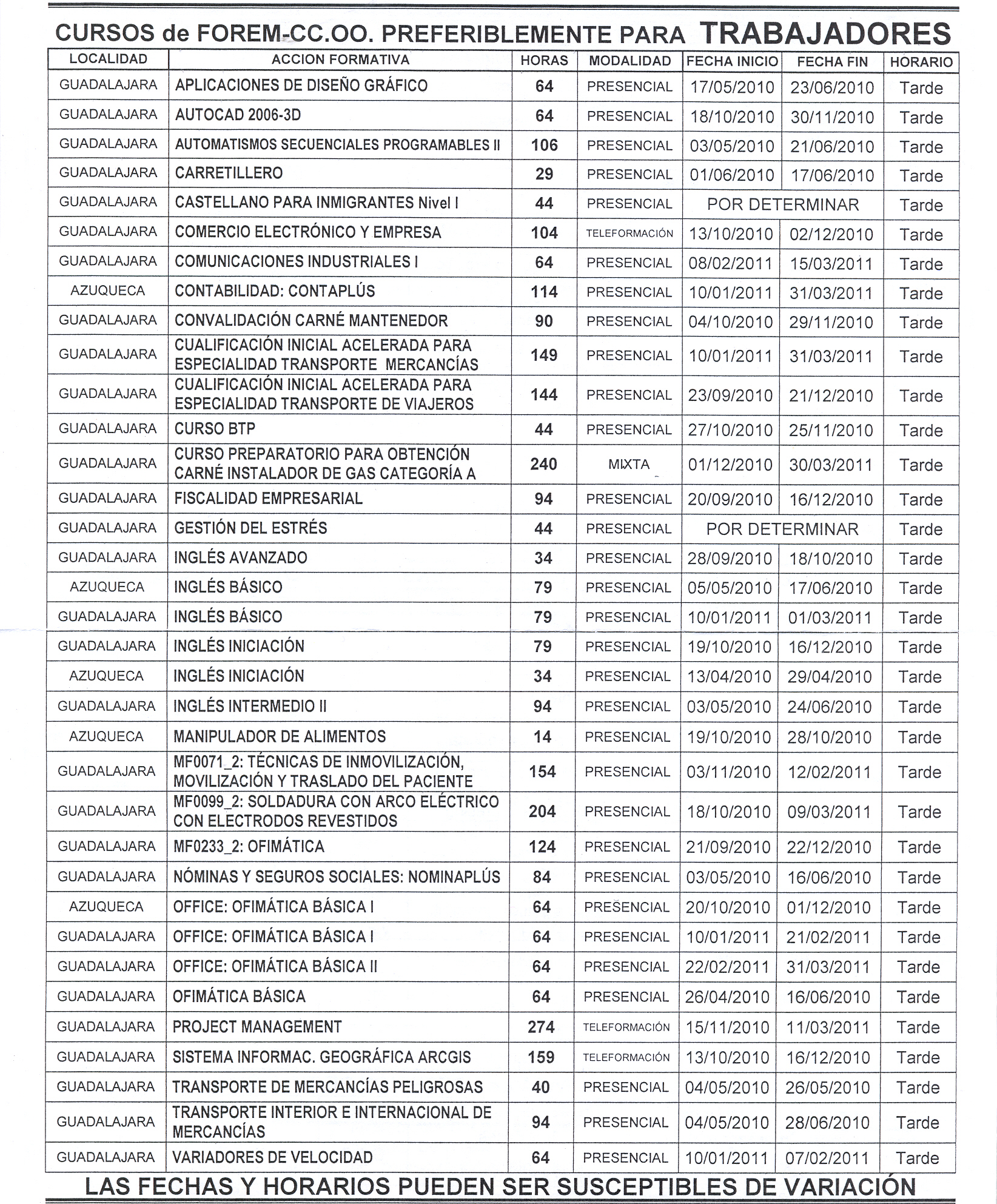 CURSOS PREFERIBLEMENTE PARA TRABAJADORES OFERTADOS POR CC.OO.