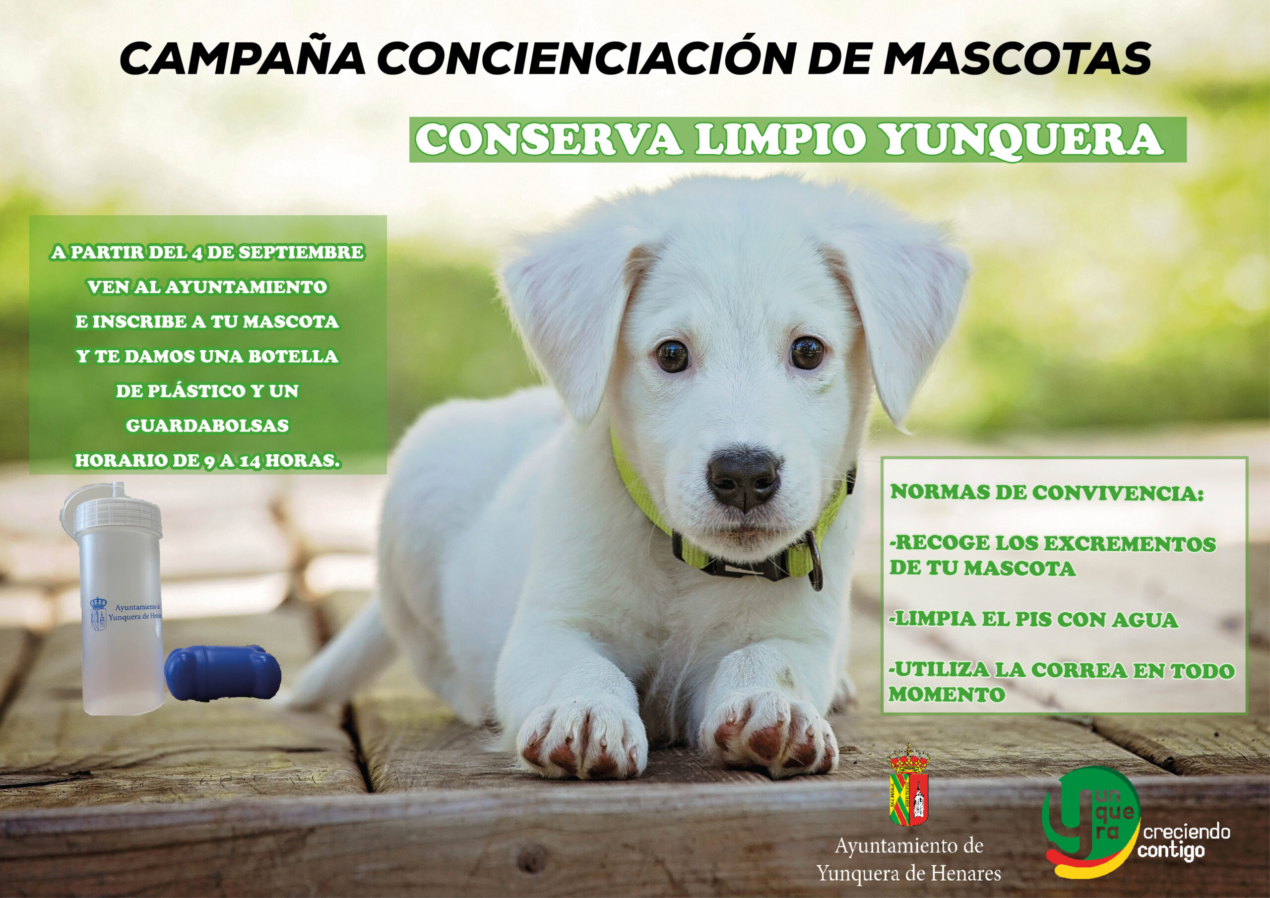 Además si inscribes a tu mascota en el Ayuntamiento a partir del 4 de septiembre te obsequiamos con una botella de plástico y un guardabolsas para las necesidades de tu mascota. Los vecinos que tenéis inscritas a vuestras mascotas también podéis recoger el pack.
