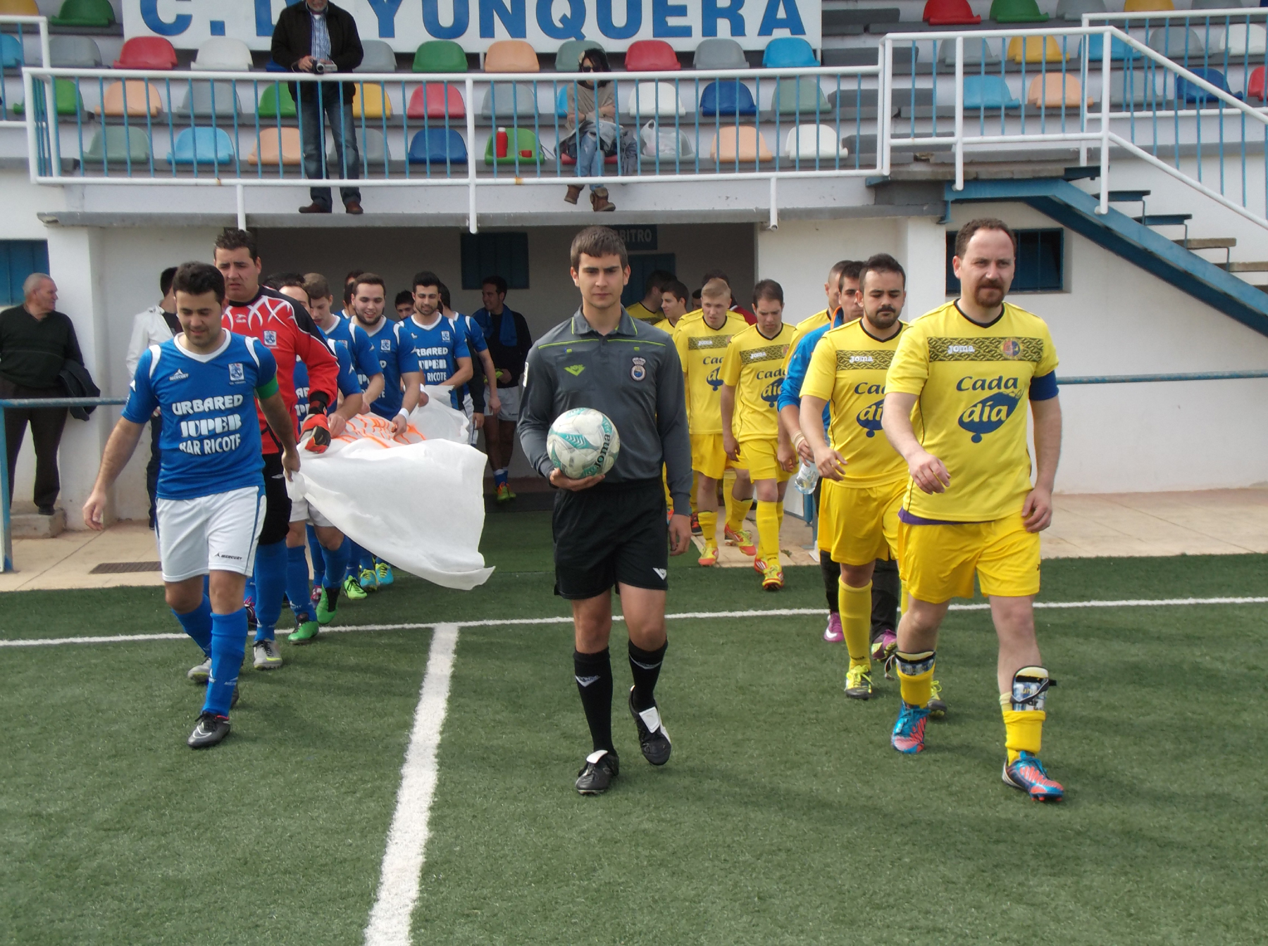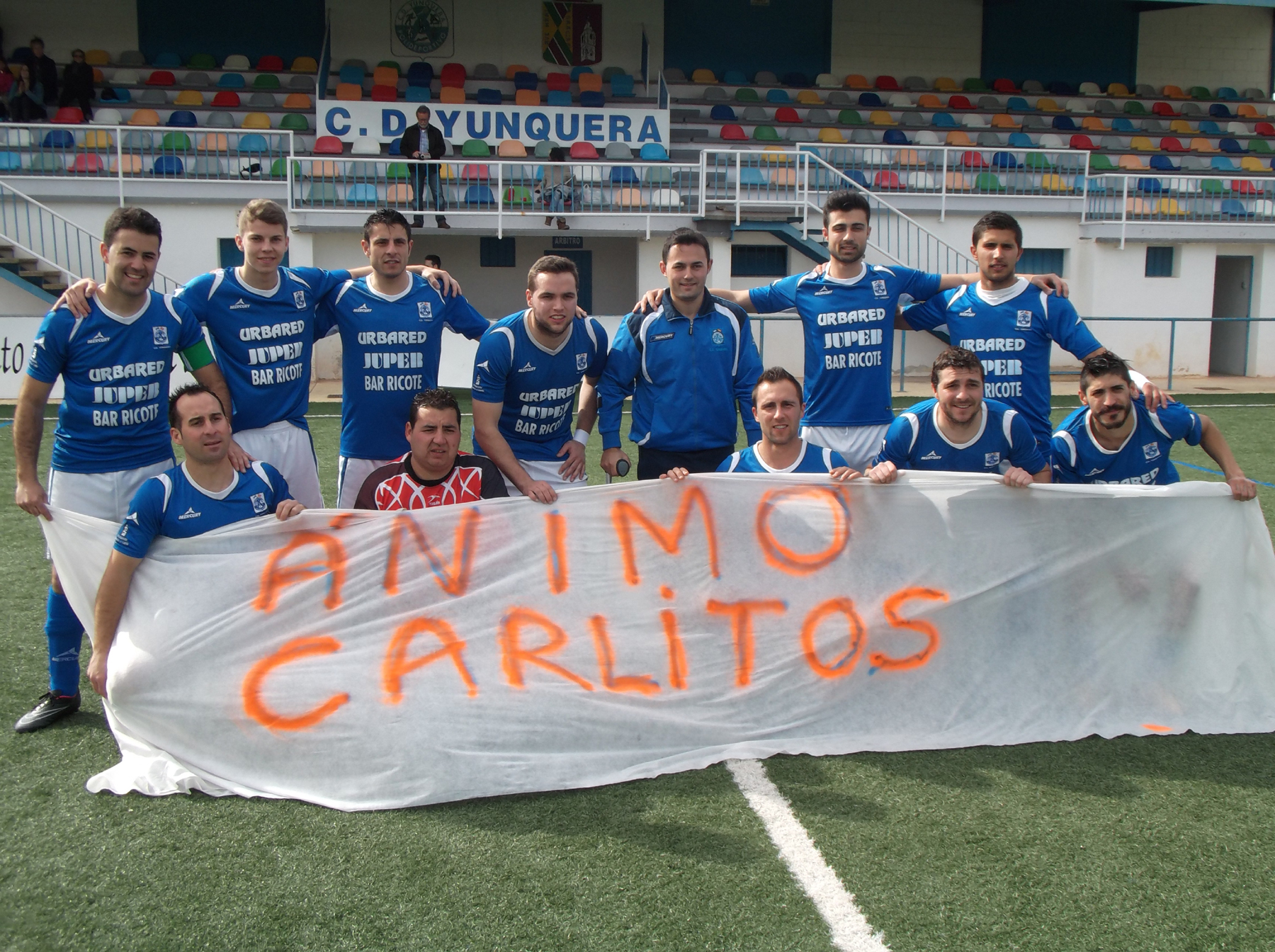 Los jugadores yunqueranos saltaron al terreno de juego con una pancarta en la que se podía leer “ÁNIMO CARLITOS” en señal de apoyo a su compañero Carlos González que hace pocas fechas fue intervenido quirúrgicamente de una lesión en su rodilla izquierda