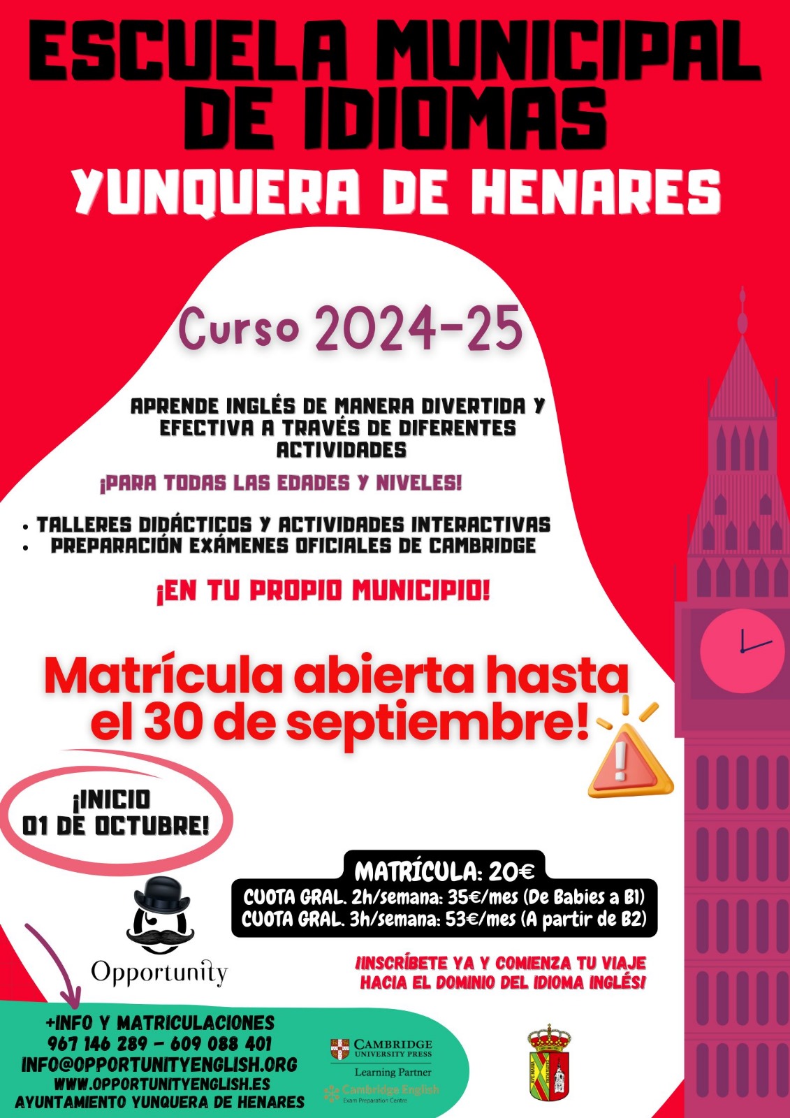 Informaci贸n y matriculaciones en el tel茅fono 967 146 289 y 609 088 401, en el email: info@opportunityenglish.org y en la pagina web www.opportunityenglish.es