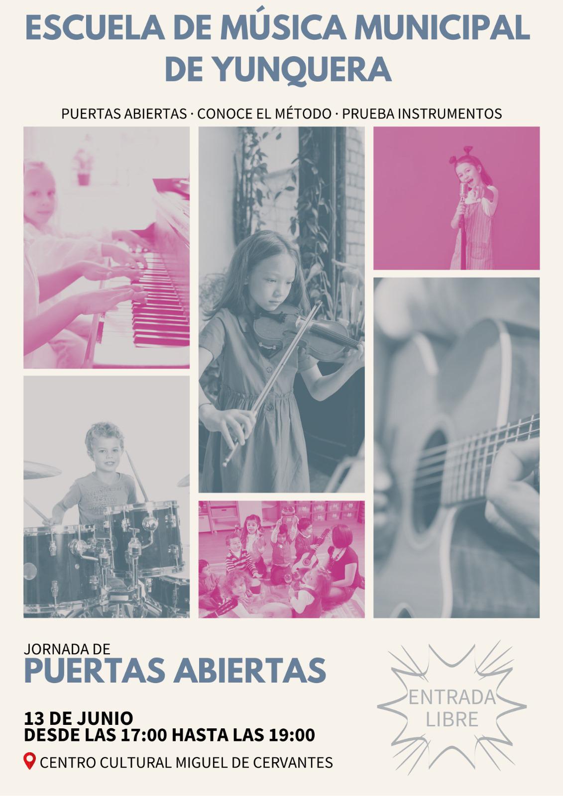 La Escuela de M煤sica Municipal de Yunquera de Henares celebra ma帽ana d铆a 13 de junio una jornada de puertas abiertas en el Centro Cultural Miguel de Cervantes de 17:00 a 19:00 horas.