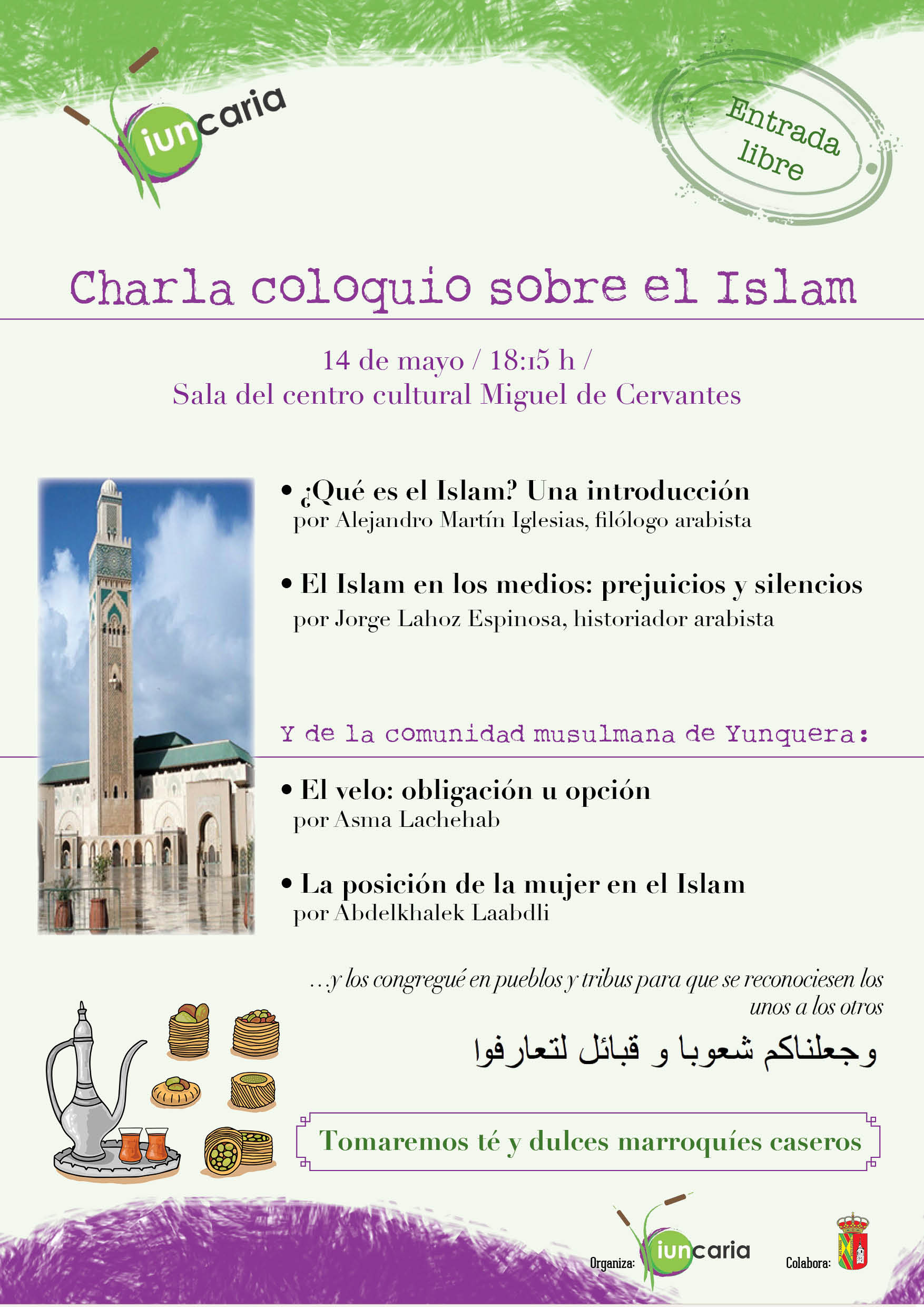 Con esta charla coloquio, Iuncaria quiere hacer un espacio abierto a la convivencia, concordia y al conocimiento de las distintas culturas con las que convivimos. El acto será el 14 de mayo a partir de las 18:15 en la sala de la Casa de la Cultura (plaza de Miguel de Cervantes).