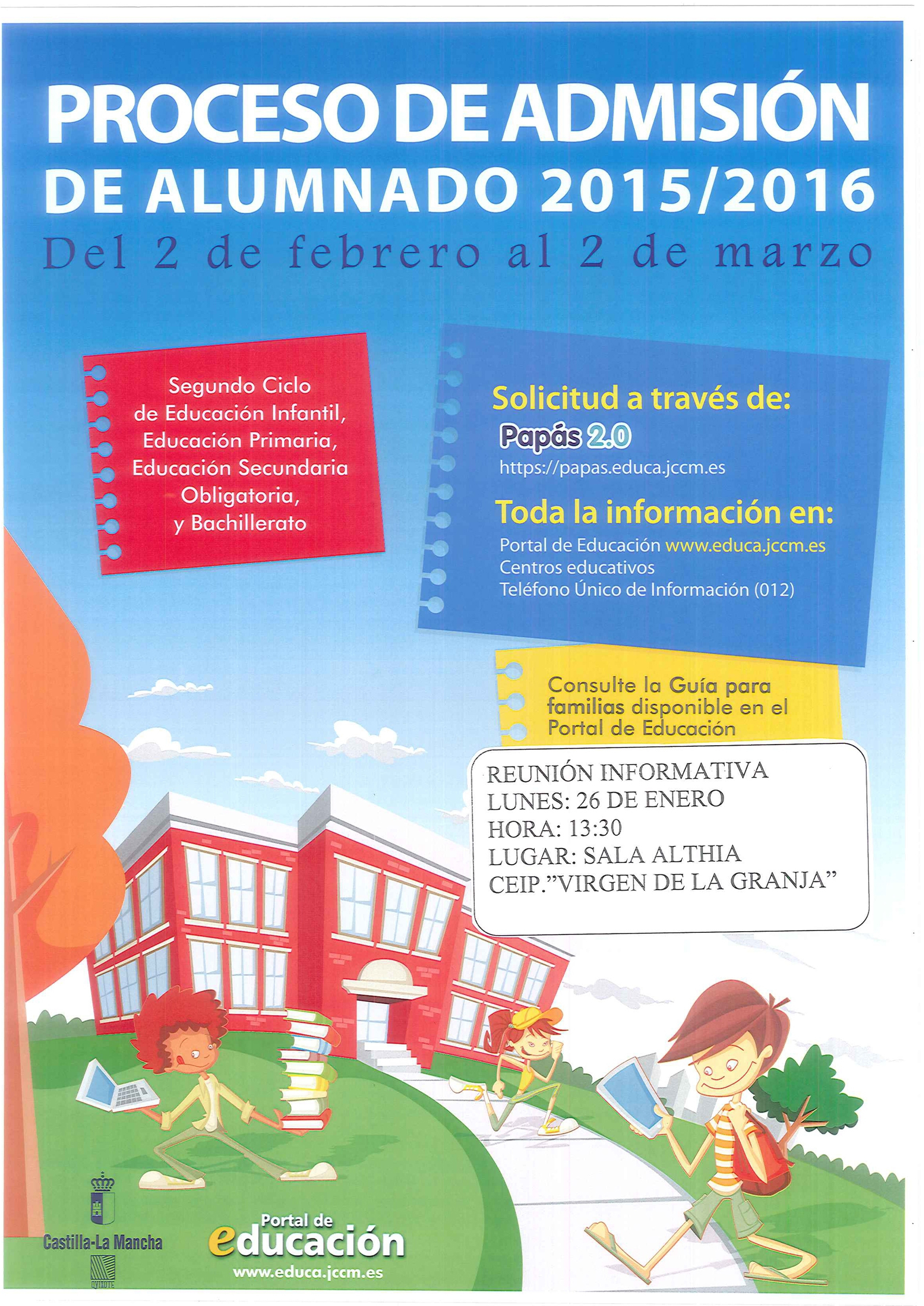 Para determinados procedimientos establecidos en la Orden de 22/01/2007, modificada por Orden de 15/01/2013, de desarrollo del proceso de admisión del alumnado en los centros docentes públicos y privados concertados que imparten enseñanzas de Educación Infantil, Educación Primaria, Educación Secundaria Obligatoria y Bachillerato en Castilla-La Mancha el plazo de solicitud será desde el día 2 de febrero hasta el día 5 de marzo.