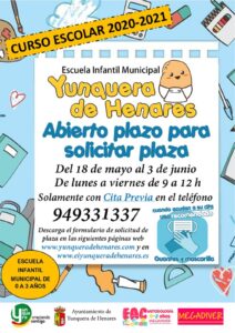 La Escuela Infantil Municipal de Yunquera de Henares ha abierto sus puertas para recibir las solicitudes de plaza de cara al próximo curso, después de haber sido correctamente desinfectada. Los interesados serán atendidos desde el 18 de mayo hasta el 3 de junio, de lunes a viernes entre las 9.00 y las 12.00 horas.