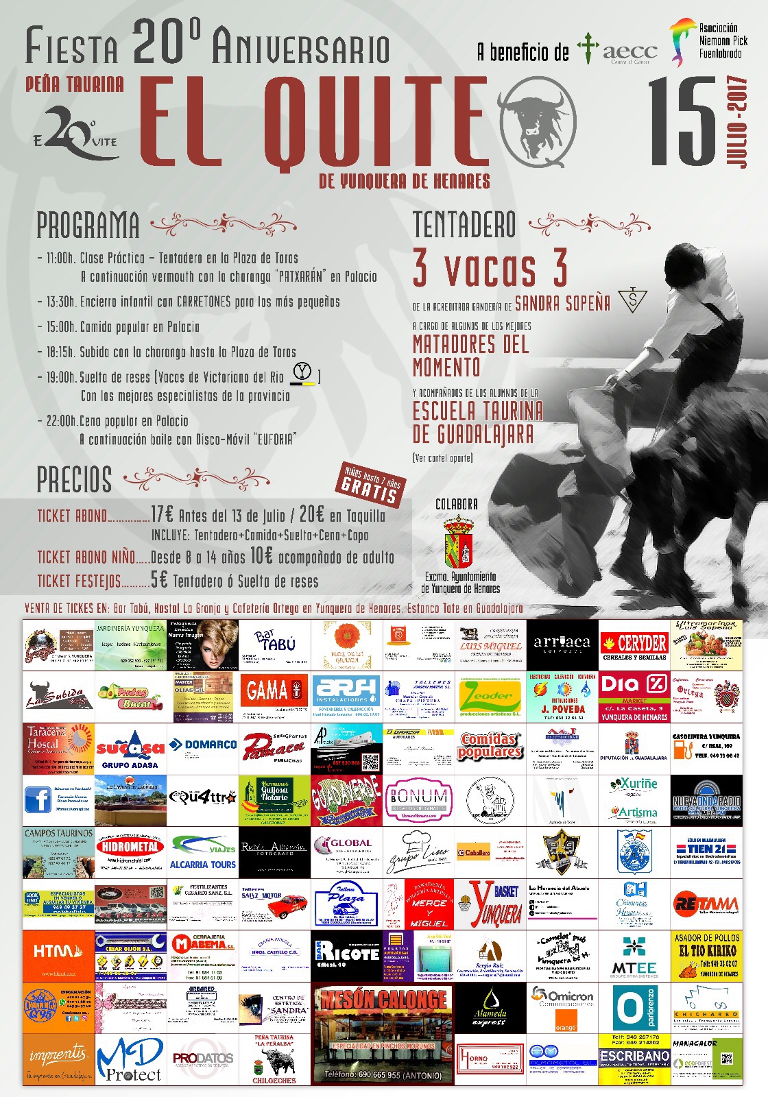 Puedes conseguir tu abono anticipado (Tentadero – Comida+Refresco – Suelta de Vacas – Cena – Copa) por solo 17€ en los puntos de venta autoridados. Bar Tabú, Cafetería Ortega y Hostal La Granja en Yunquera de Henares, así como en el Estanco Tote de Guadalajara. El mismo dia 15 de Julio, también podrás retirar tu abono en taquilla por un precio de 20€, así como las entradas para los dos festejos taurinos, por 5€ cada uno.