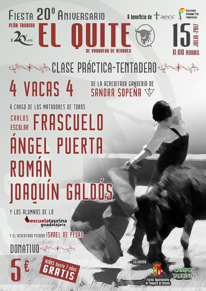 El día comenzará a las 11 de la mañana con un Tentadero – Clase Práctica protagonizado por varios de los mejores matadores del momento, los cuales acompañarán a los chavales de la Escuela Taurina de Guadalajara, lidiándose 4 vacas de la ganadería vecina Sandra Sopeña.