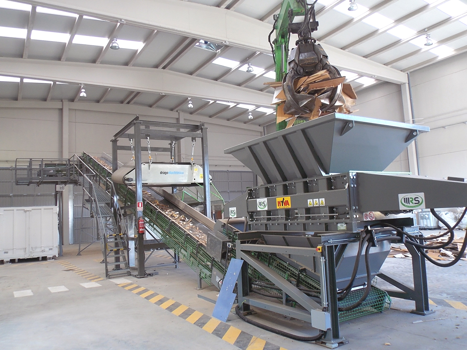 Tras el control y pesaje del vehículo, y una vez descargado, una máquina tipo “pulpo” realiza una primera selección trasladando los materiales que no son objeto de trituración a diferentes contenedores. Una vez seleccionados, y separados los materiales no aptos, son transportados a la trituradora y de allí mediante una cinta transportadora pasan a los contenedores para su expedición como producto valorizable. Otra cinta, con un electroimán, se encarga de separar los materiales férricos que pudieran encontrarse entre el material triturado para dirigirlos hacia otro contenedor para su venta como chatarra.