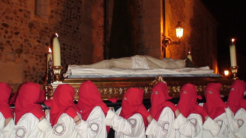 Todo comienza en torno a las 23:30 horas, cuando los hermanos (ya sin capa blanca, en señal de luto por el fallecimiento de Jesús) se encaminan en busca del párroco, Don Antonio de Gregorio Ruiz y se dirigen a la Ermita de la Virgen de la Soledad. Desde allí y en torno a la medianoche se procesiona la talla de ‘El Santo Entierro’. Los anderos realizan unos movimientos lentos y pesados, que intentan asemejarse a los de Jesús con la carga de la cruz, mientras que en diferentes momentos y obedeciendo a un toque de corneta levantan el paso a modo de ofrenda. Dicha celebración, que simula el entierro de Jesús, se realiza en respetuoso silencio y acompañado de dos grandes filas de antorchas que iluminan el paso. Además, desde hace unos años y debido a que en una ocasión varios integrantes de la Hermandad decidieron de forma anónima hacer penitencia, tres integrantes de la organización cargan con sendas cruces y los pies encadenados, acompañando a la comitiva.