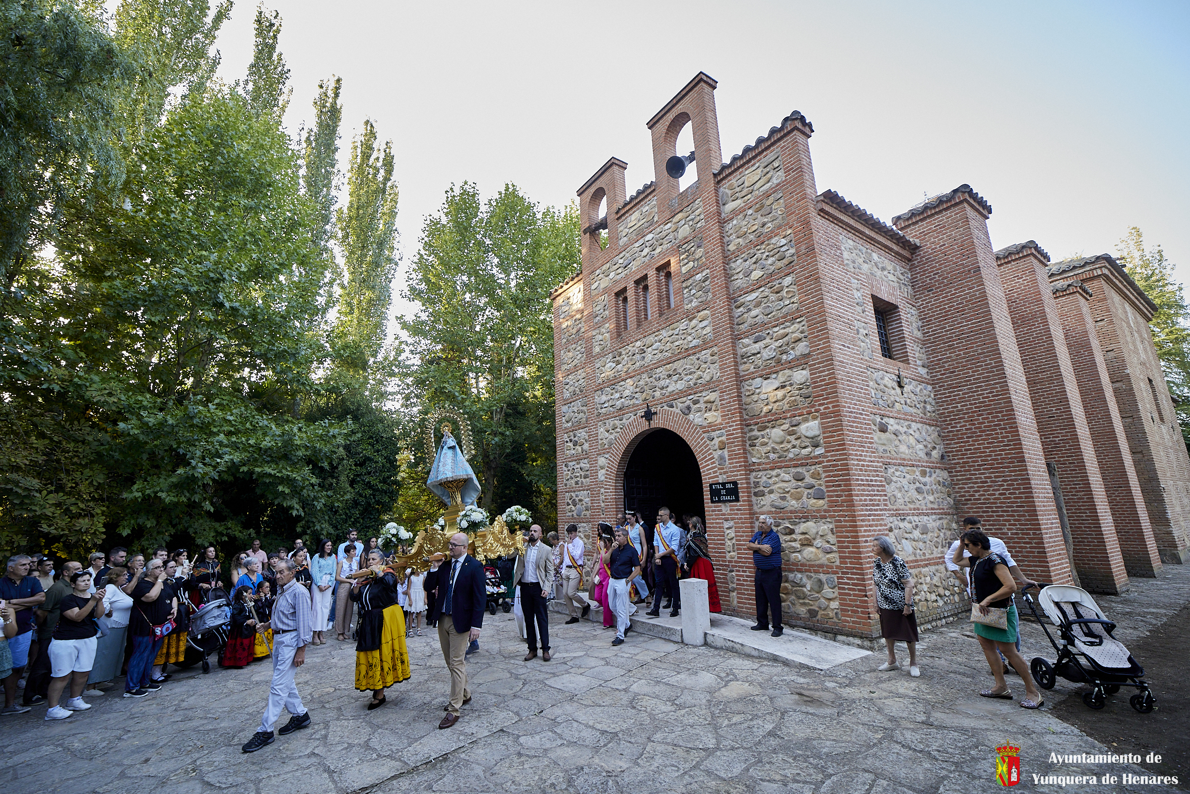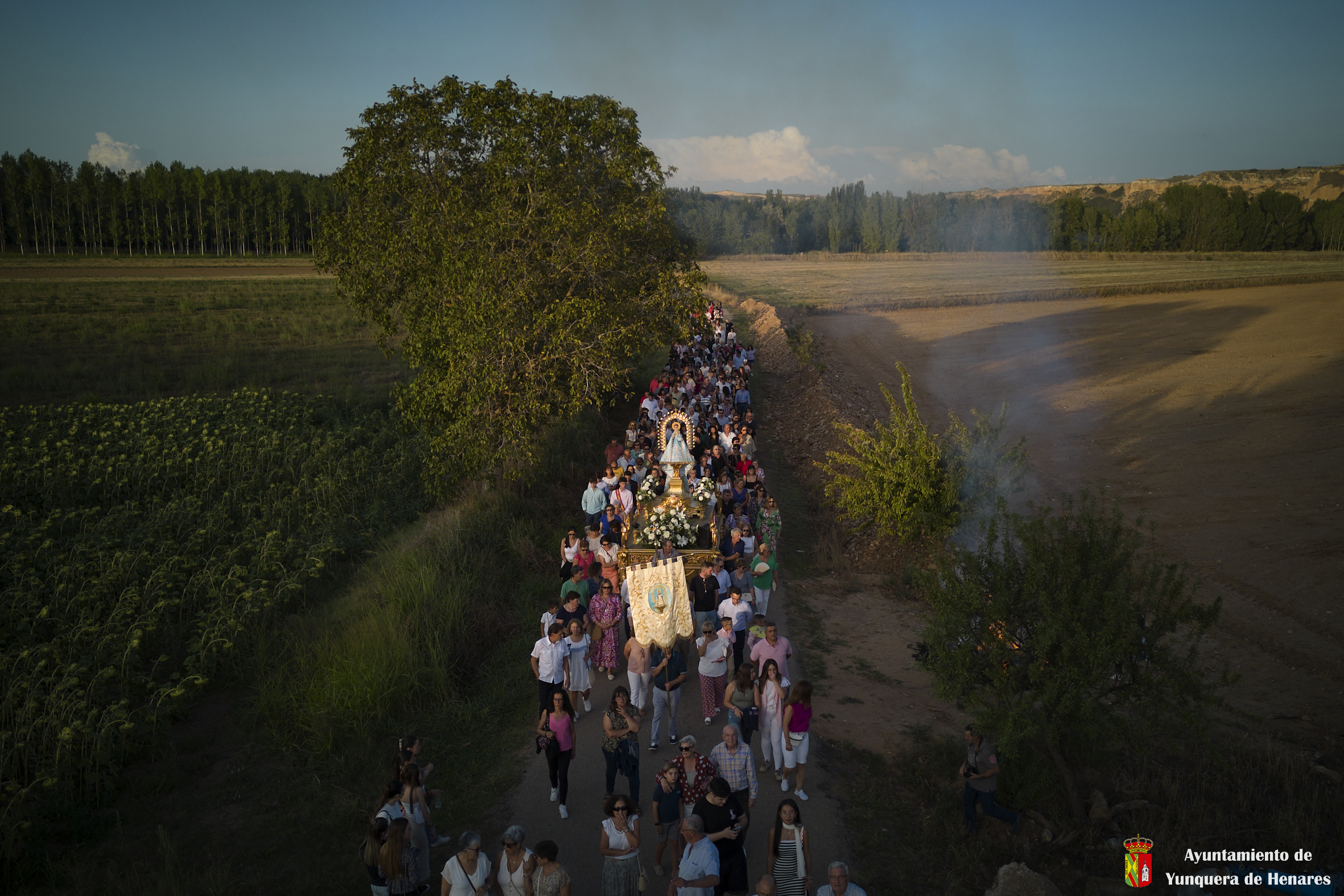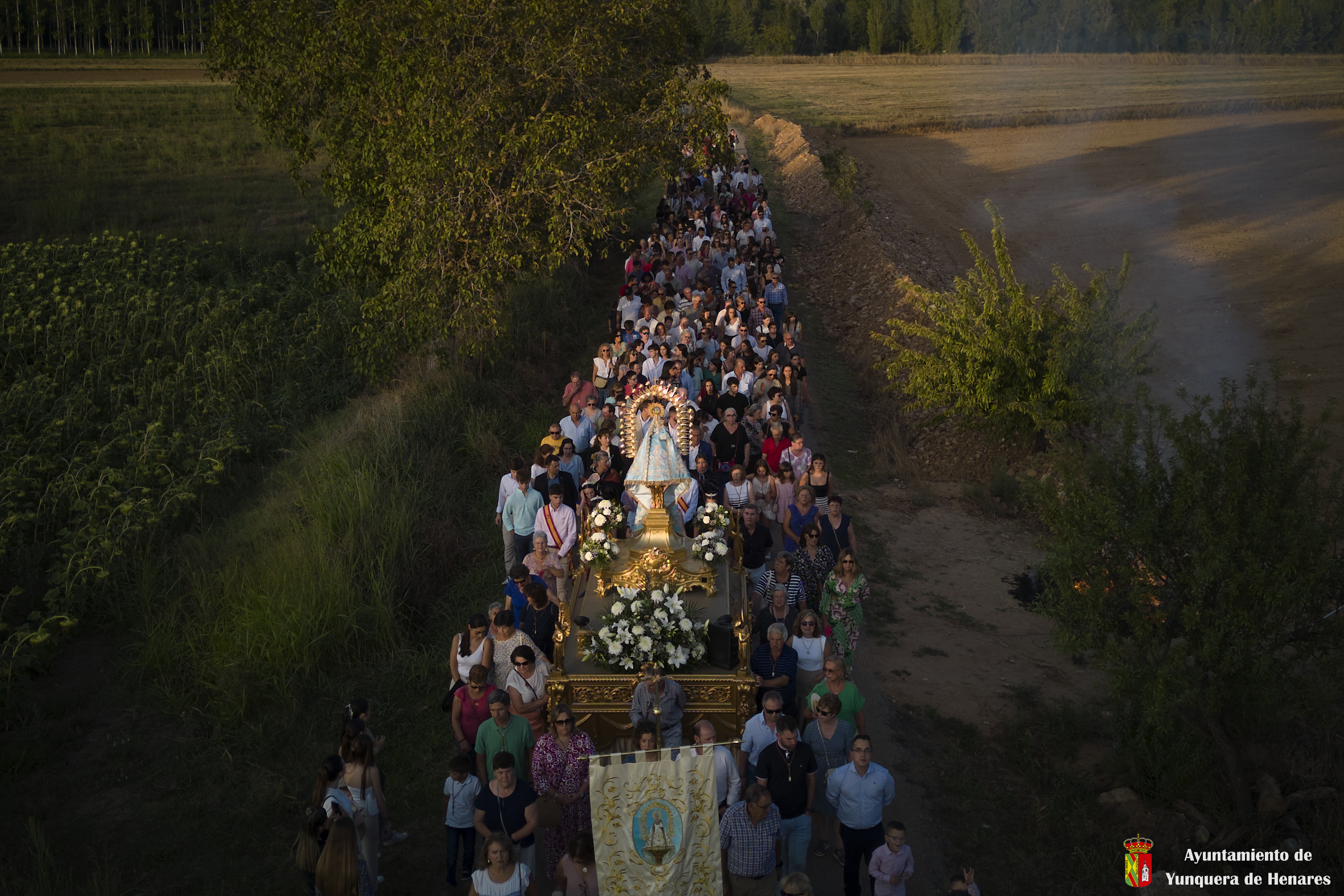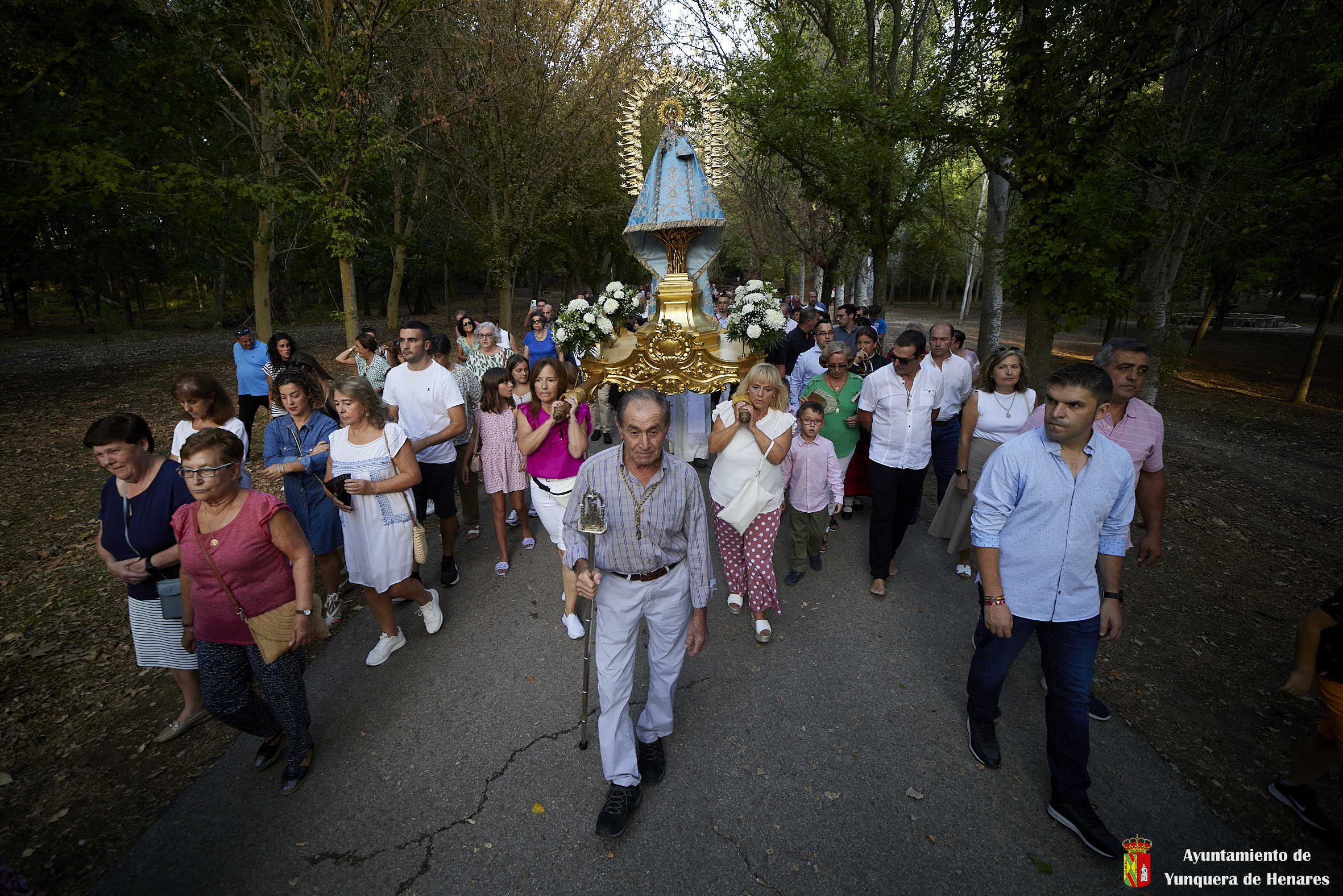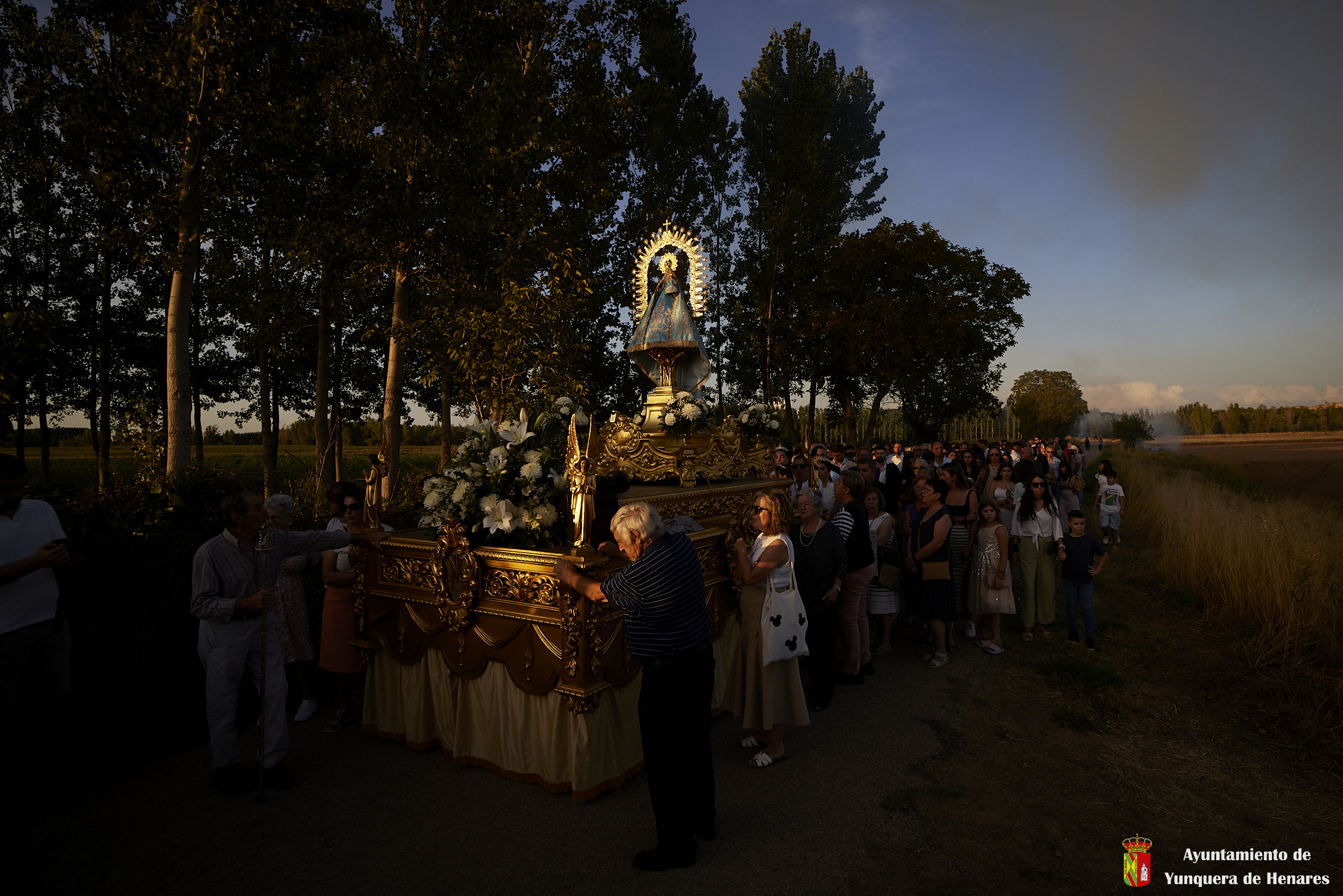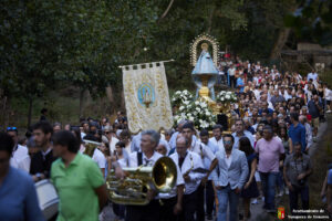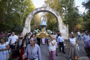 Decenas de personas esperaban a la Patrona alrededor de su santuario, y una vez que comenzaba la procesión acompañaban a la Virgen y a la comitiva de camino a Yunquera de Henares. La primera parte del paraje de la ermita se hace a hombro entre autoridades y fieles bajando la escalinata de la zona y es cuando se atraviesa el arco el momento en el que se coloca la imagen en la carroza.