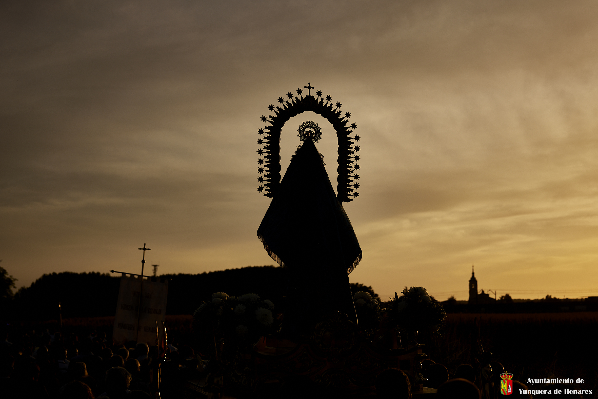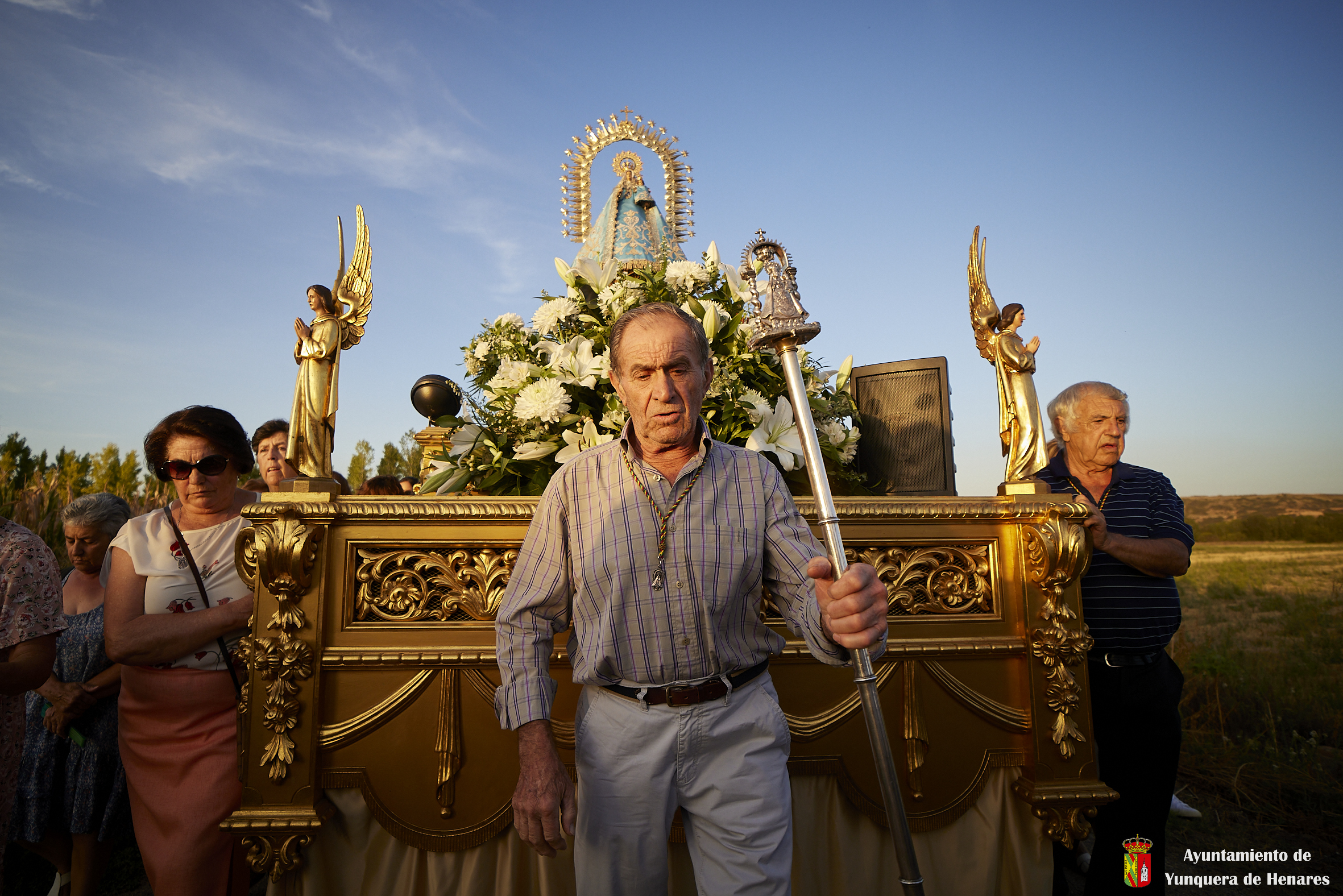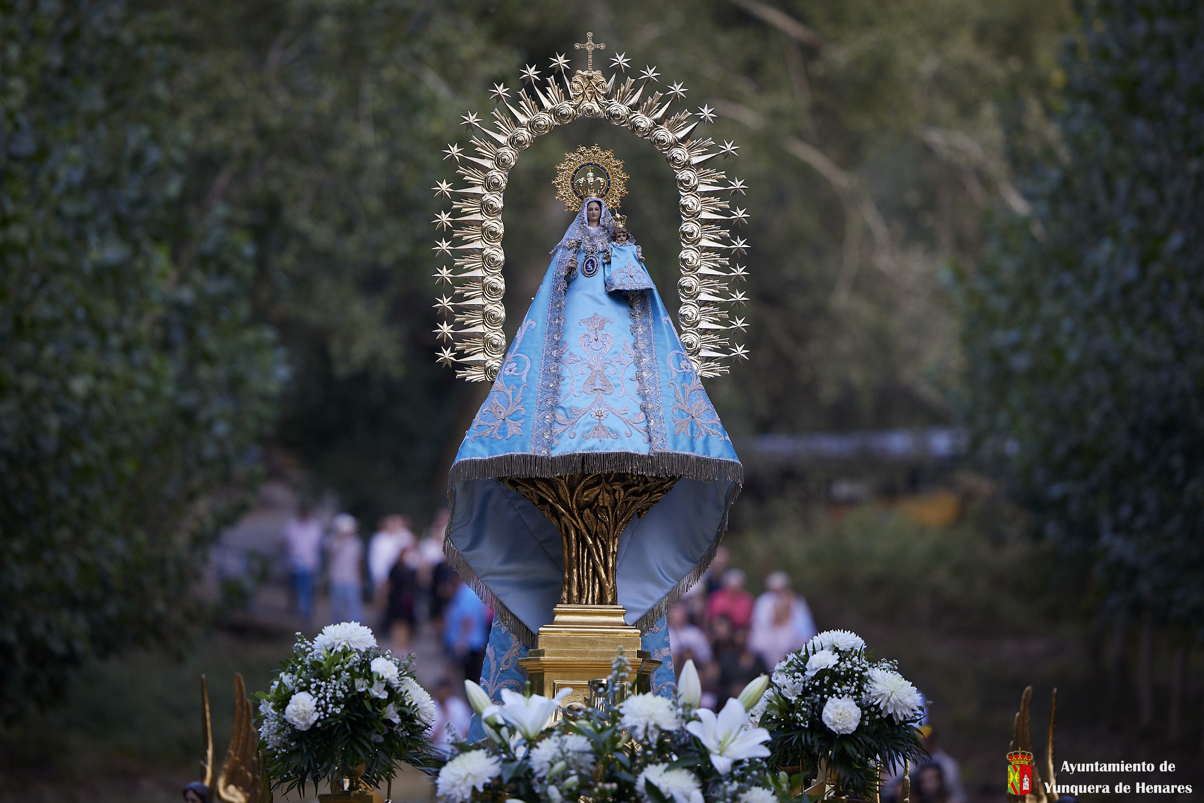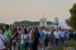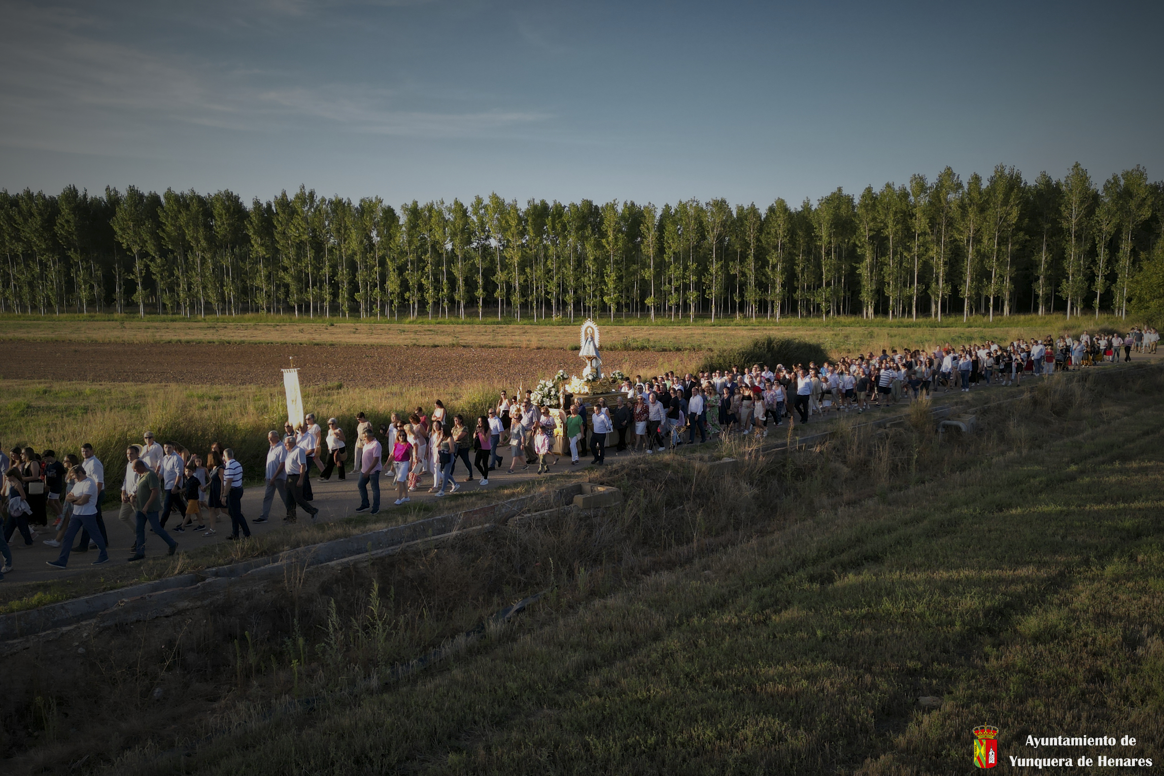 Decenas de personas esperaban a la Patrona alrededor de su santuario, y una vez que comenzaba la procesión acompañaban a la Virgen y a la comitiva de camino a Yunquera de Henares. La primera parte del paraje de la ermita se hace a hombro entre autoridades y fieles bajando la escalinata de la zona y es cuando se atraviesa el arco el momento en el que se coloca la imagen en la carroza.