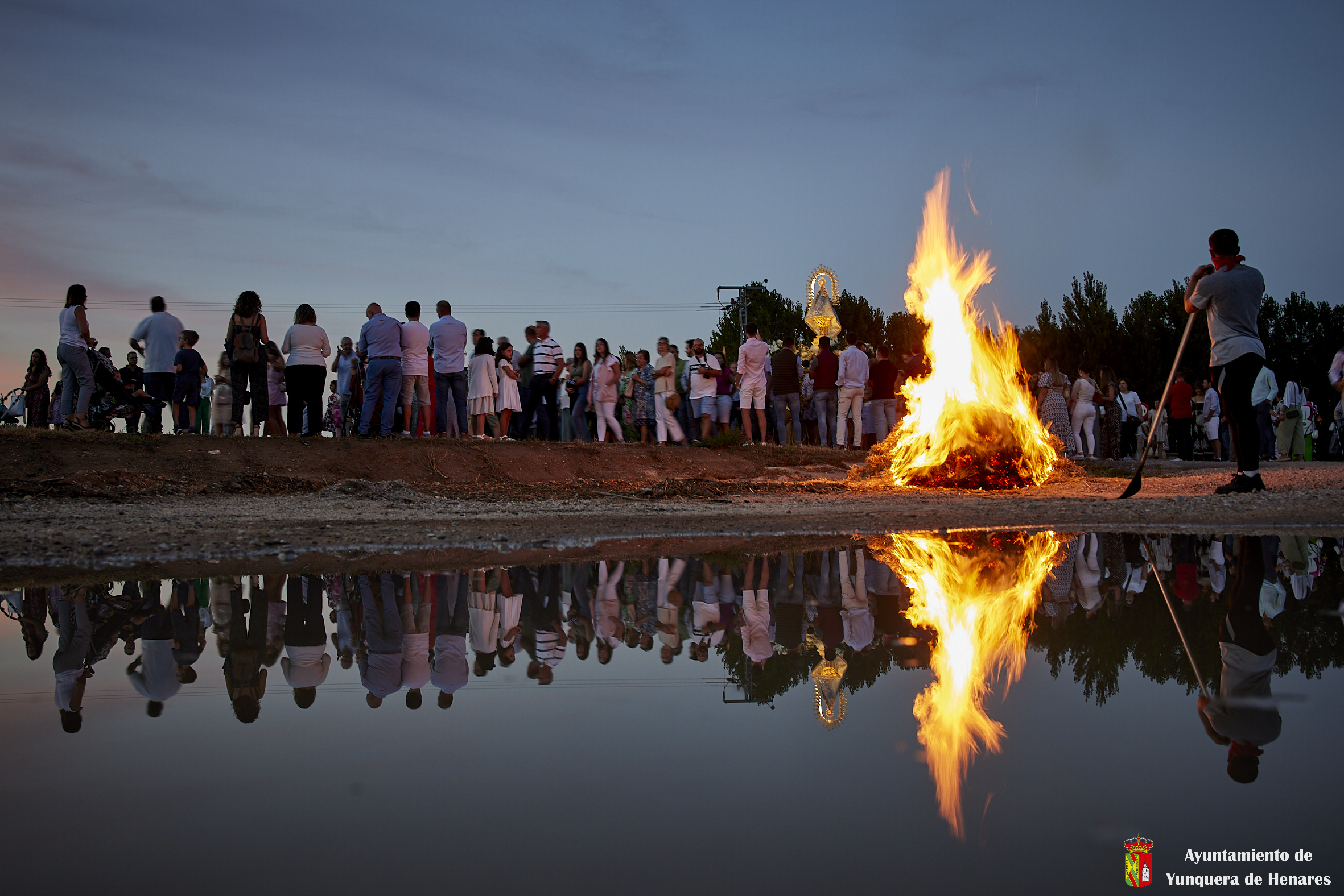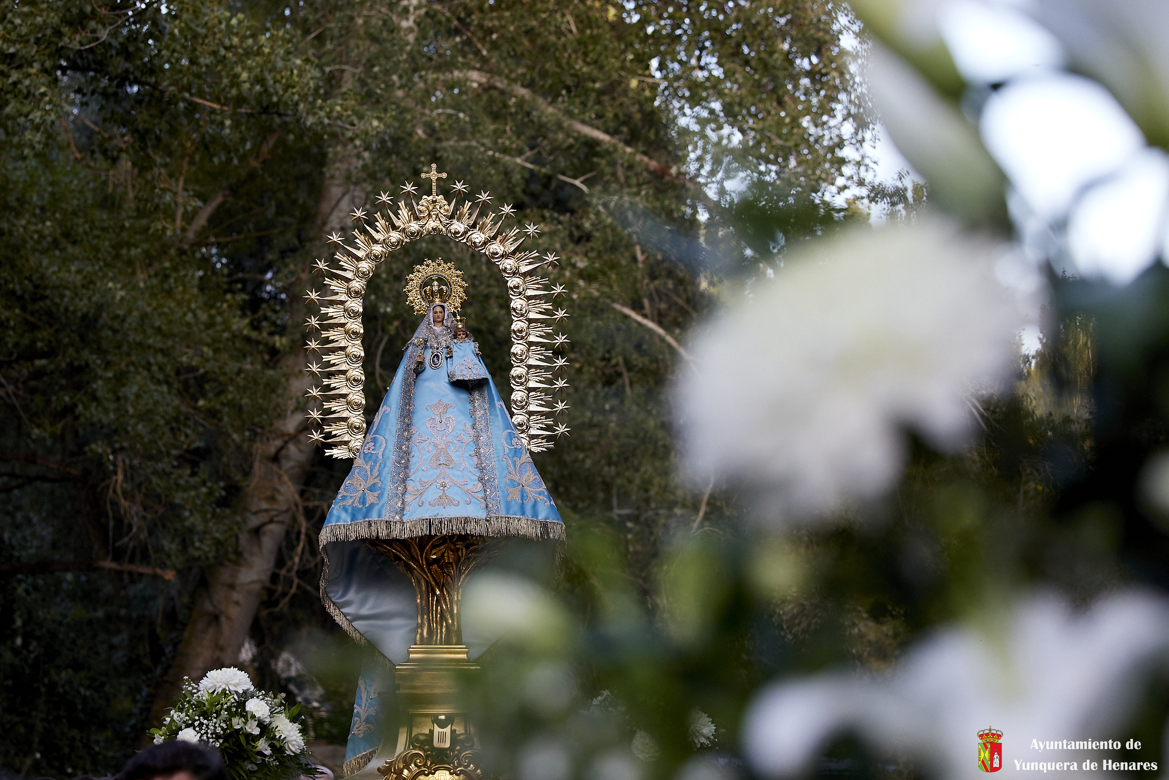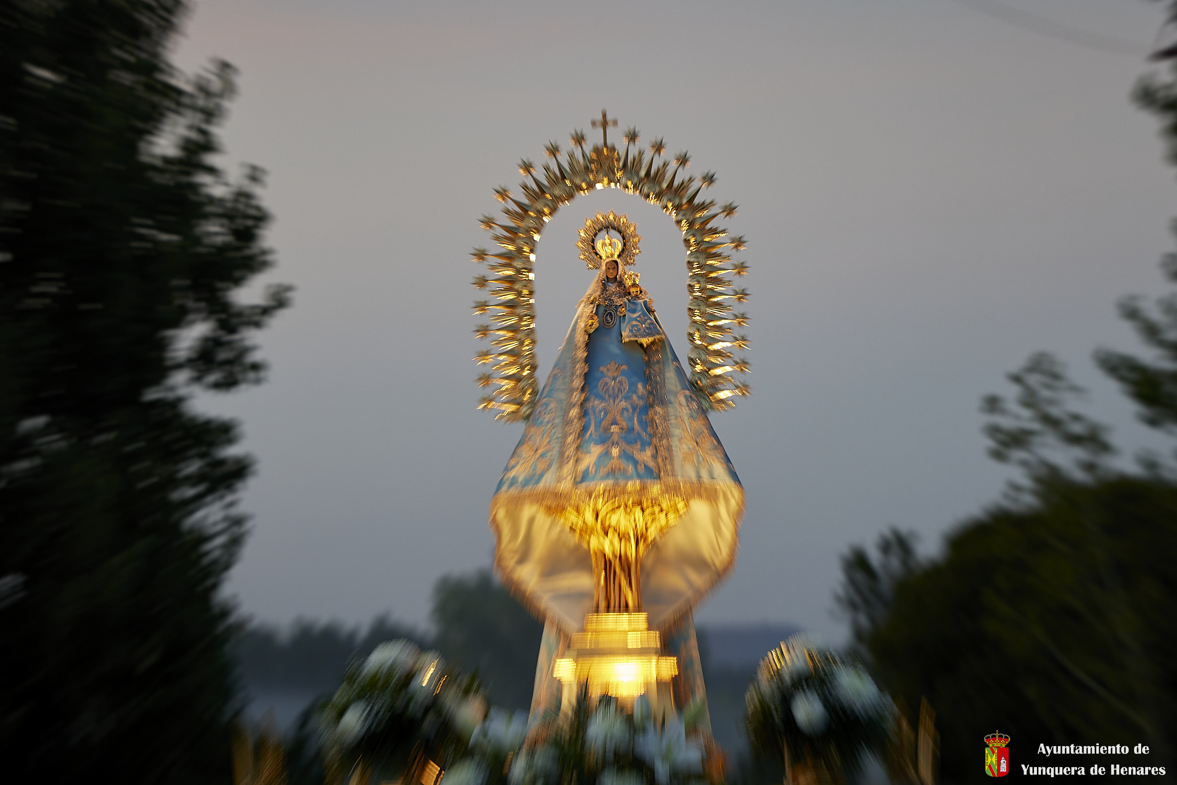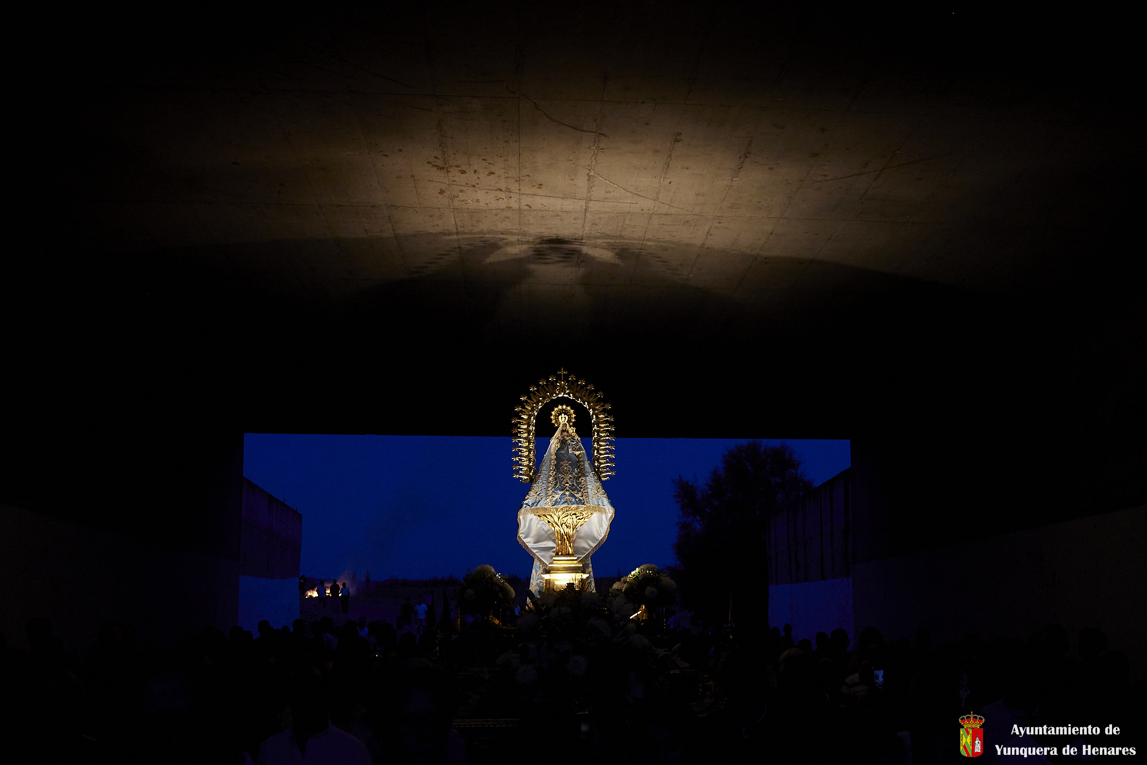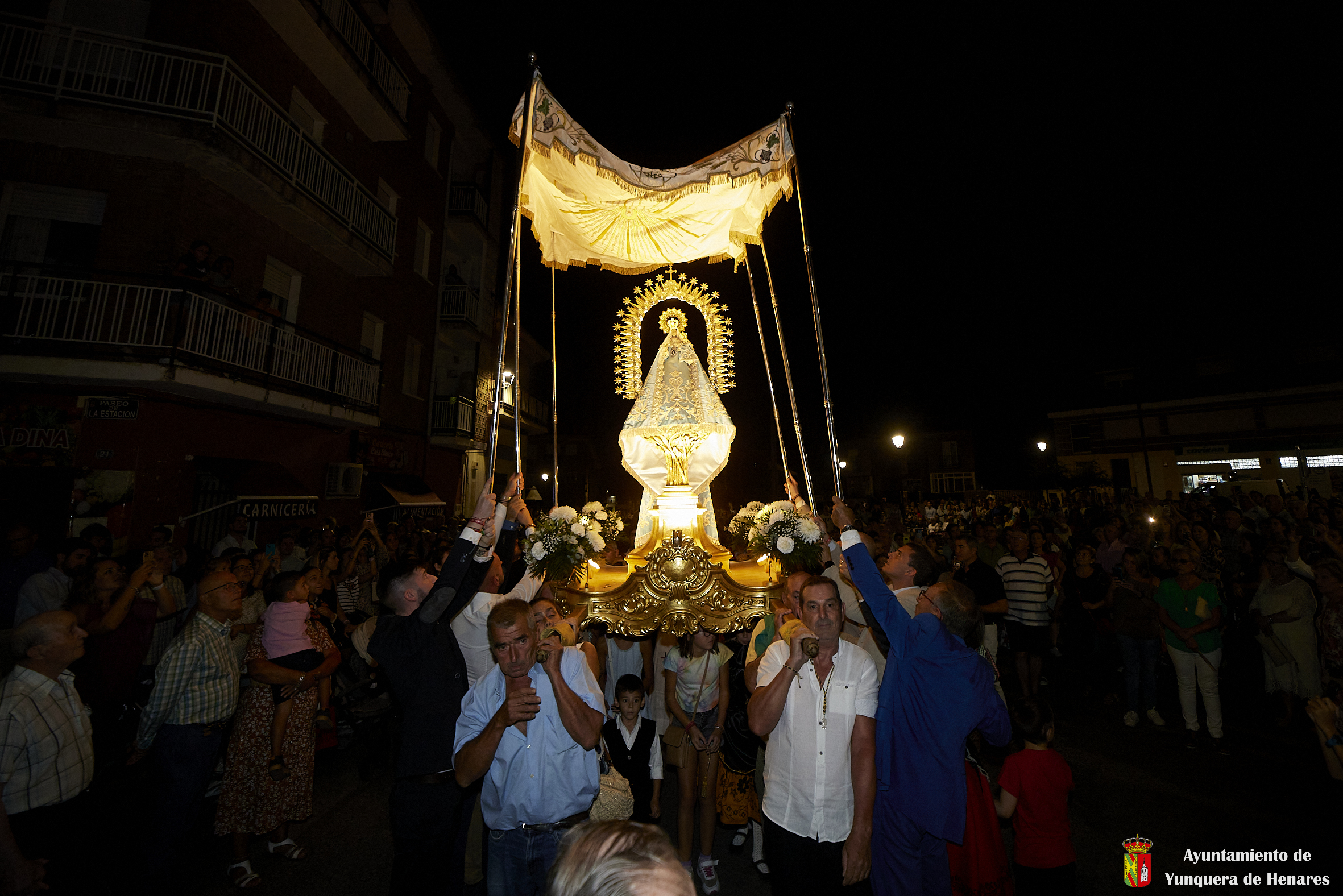 Decenas de personas esperaban a la Patrona alrededor de su santuario, y una vez que comenzaba la procesión acompañaban a la Virgen y a la comitiva de camino a Yunquera de Henares. La primera parte del paraje de la ermita se hace a hombro entre autoridades y fieles bajando la escalinata de la zona y es cuando se atraviesa el arco el momento en el que se coloca la imagen en la carroza.