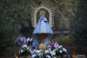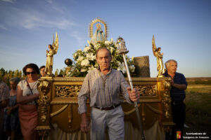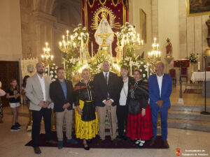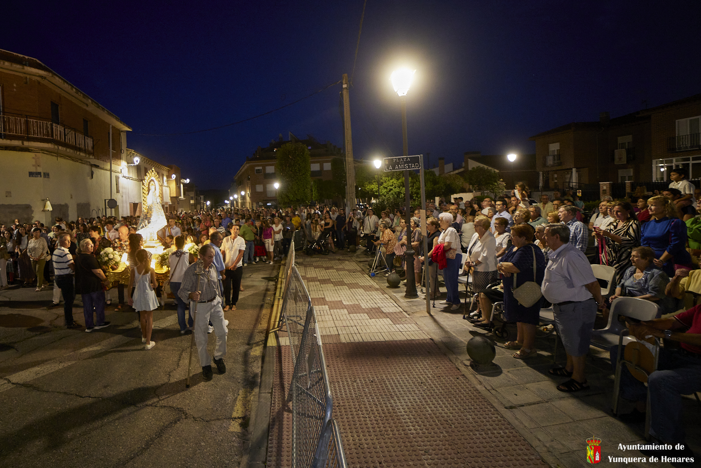 Tras el paso bajo el puente del tren y la calle La Caseta, se llegó a la plaza de La Amistad. Allí esperaban los mayores y enfermos, quien pudieron contemplarla del cerca cuando la imagen giró hacia ellos. En este punto se da otro de los momentos emotivos, cuando la Virgen pasa bajo palio, alzado por el alcalde y los concejales, como símbolo de bienvenida al pueblo. De fondo sonaban el Himno Nacional y el volteo de las campanas.