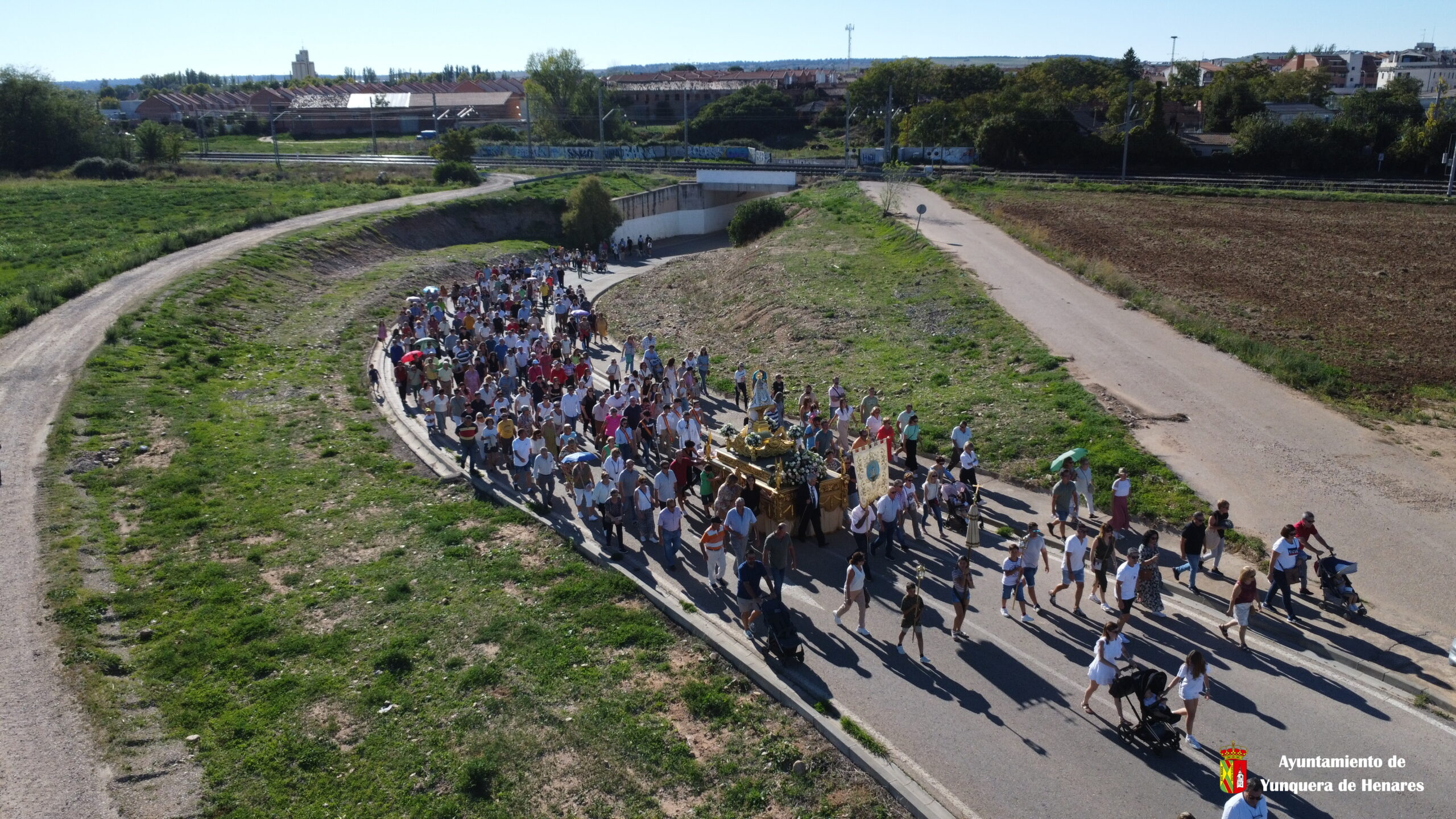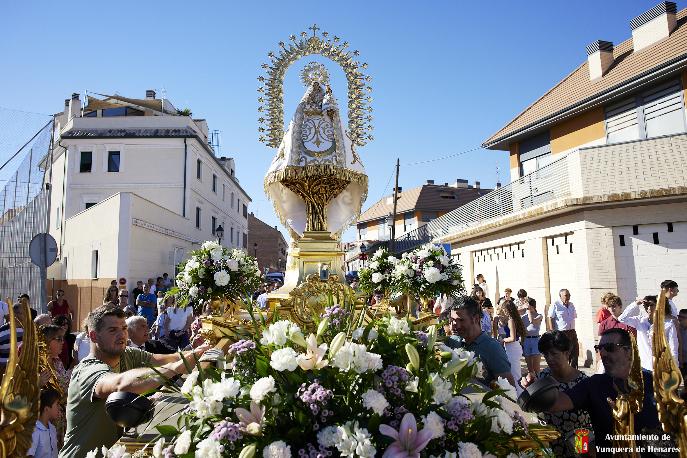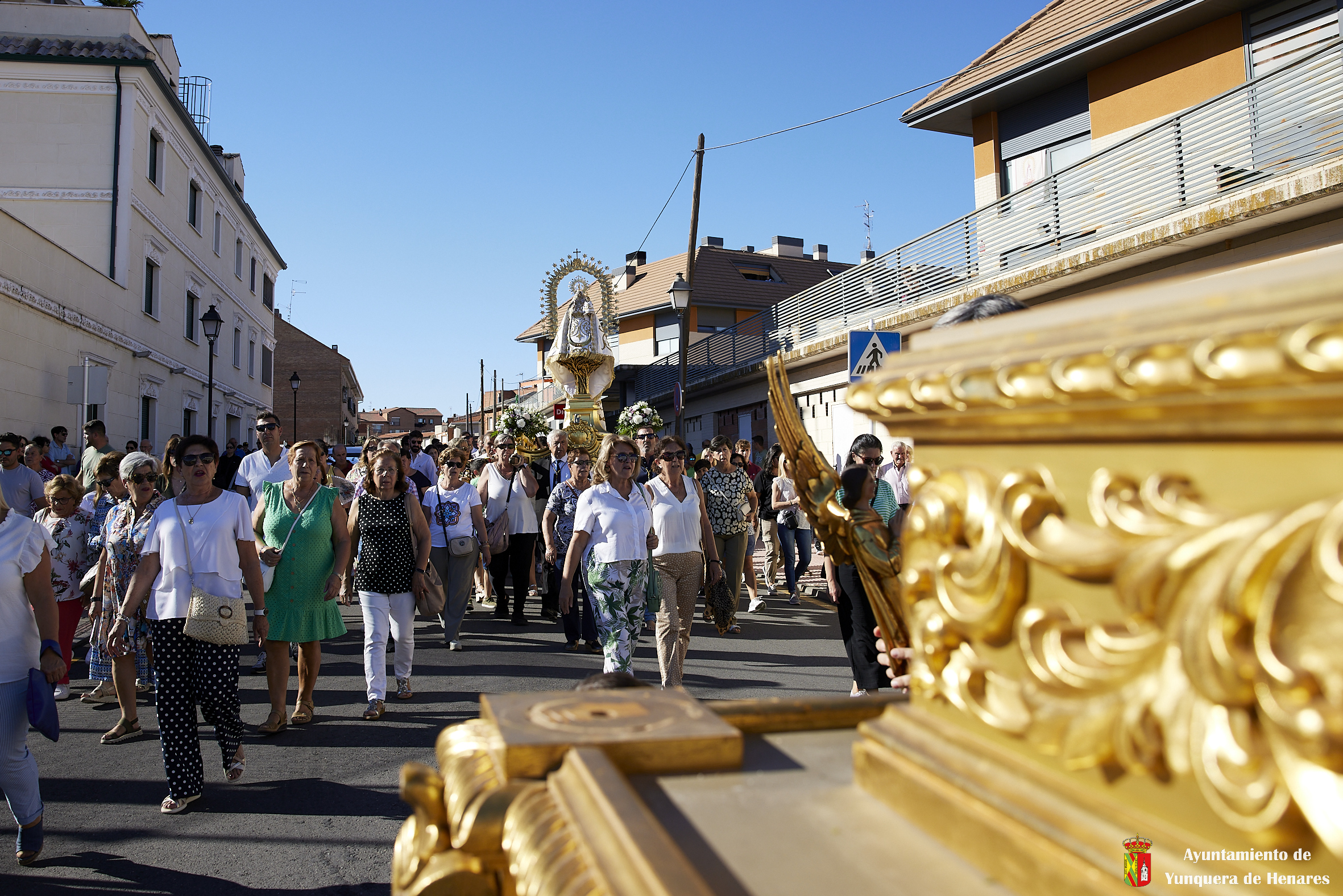 El calor de la jornada no ha impedido que decenas de yunqueranos hayan querido acompañar a la Virgen por las calles del municipio. Al principio de la procesión se carga la imagen en hombros y cuando va a salir del casco urbano, camino de la ermita, es cuando se coloca en la carroza para que el traslado se haga con más facilidad.
