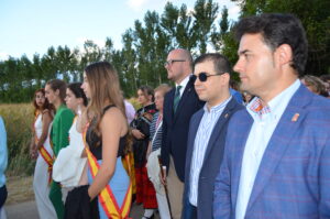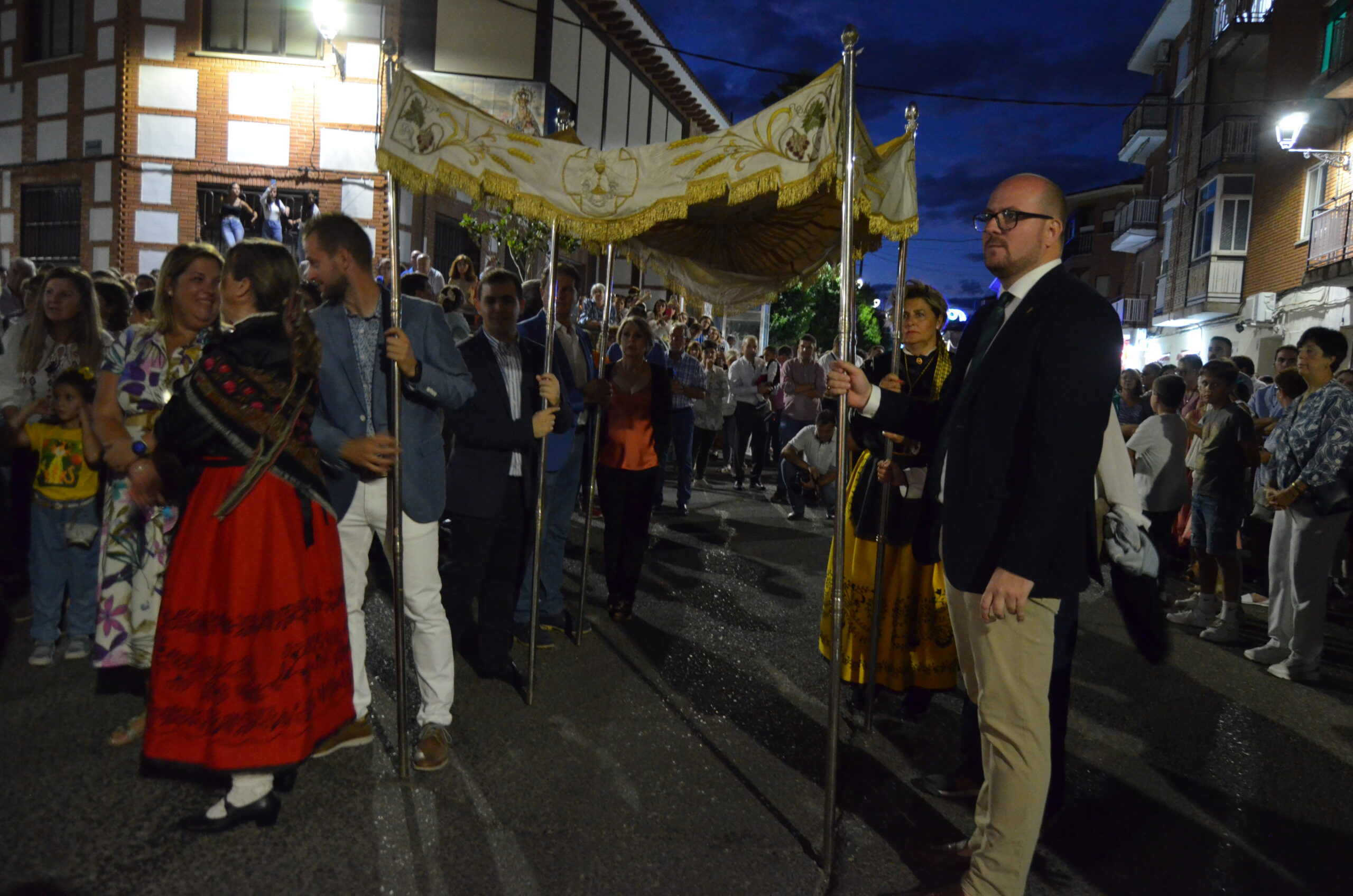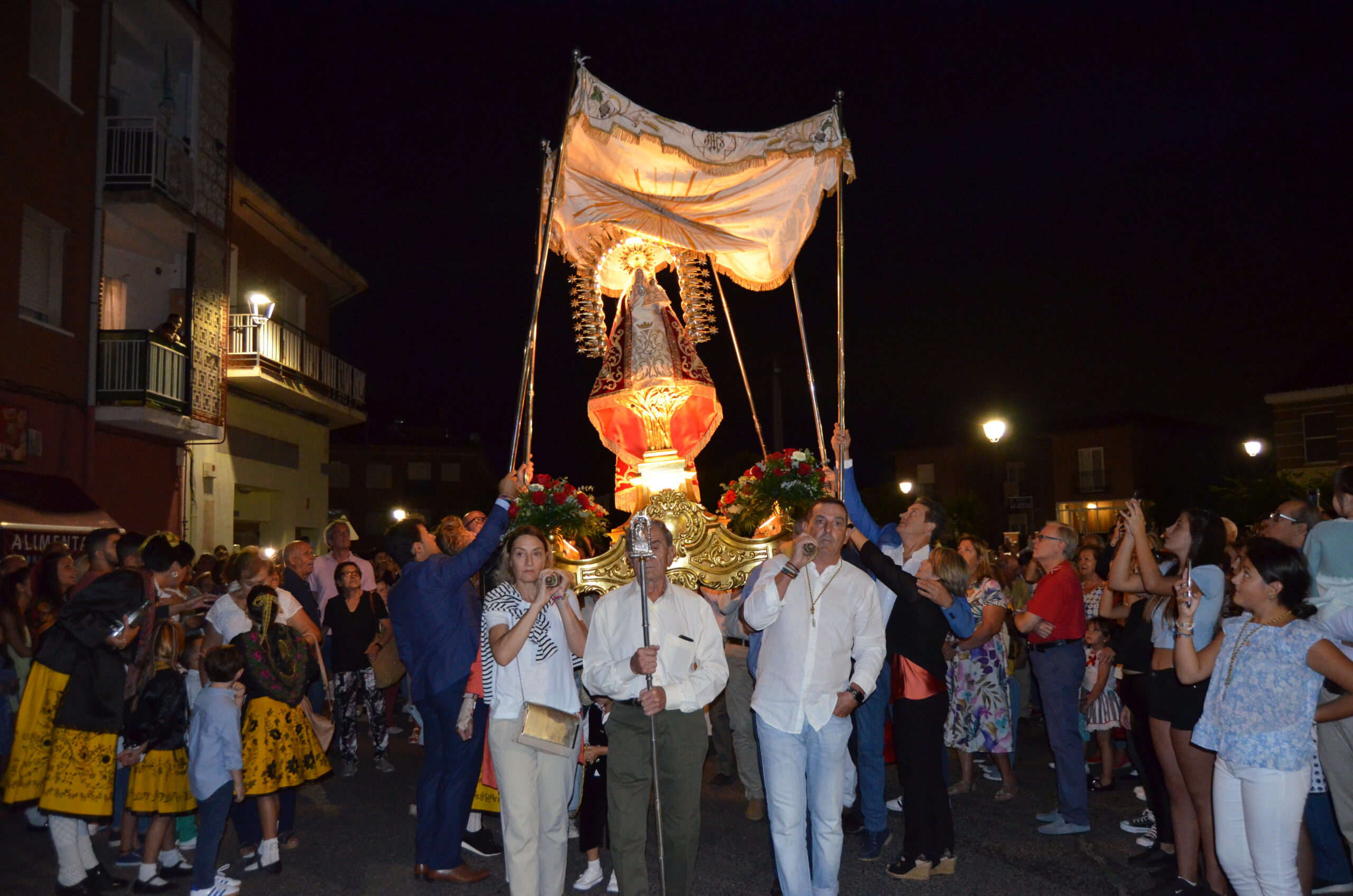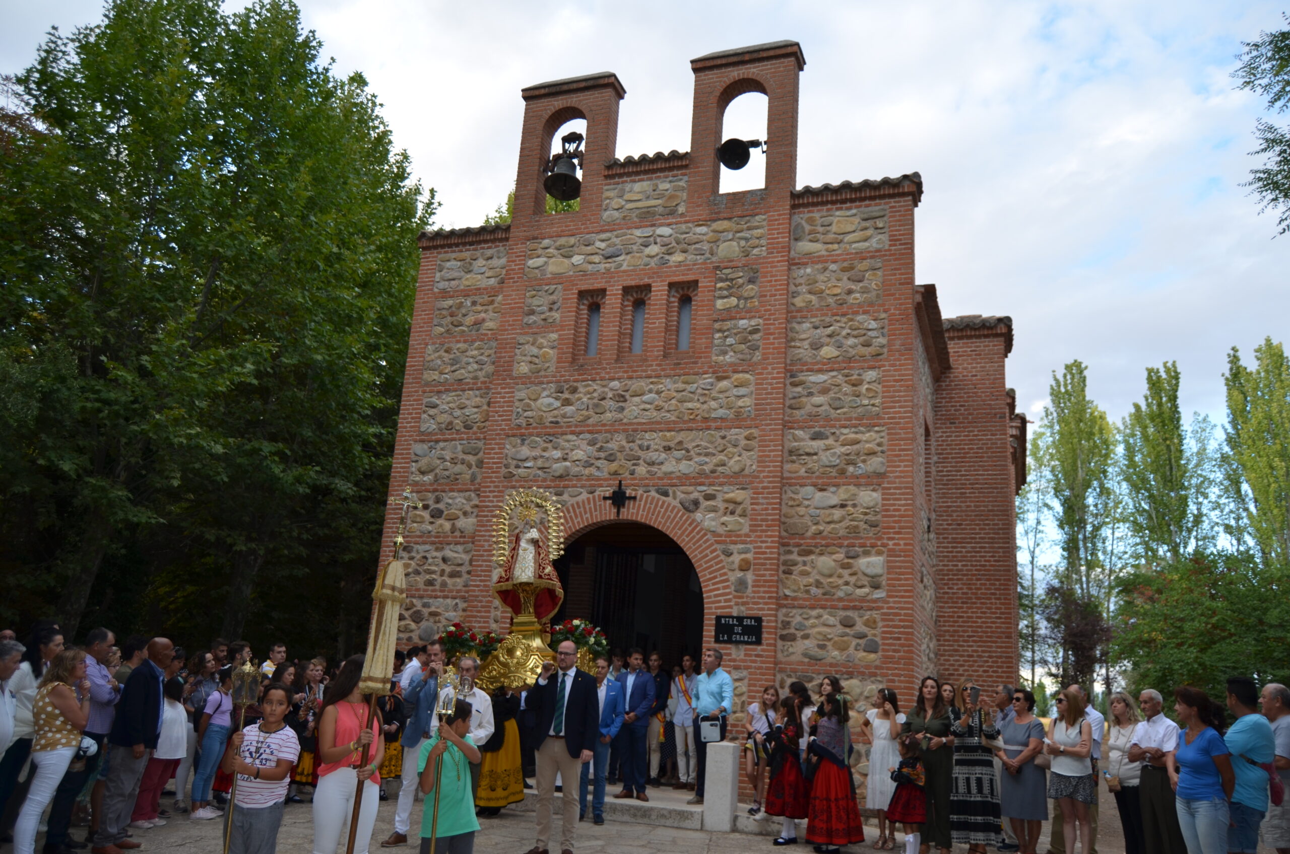 Y justo después, la Virgen de La Granja pasó bajo palio, alzado por el alcalde y los concejales, como símbolo de bienvenida al pueblo. De fondo sonaban el Himno Nacional y el volteo de las campanas.