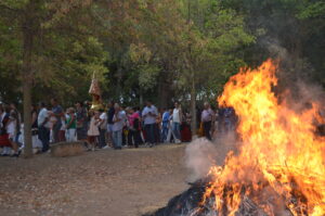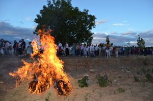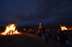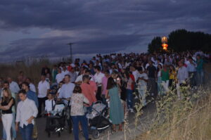 El recorrido, plagado de grandes hogueras que encendían y controlaban los jóvenes de la localidad, continuaba al paso que marcaba la Banda de Tambores y Cornetas de La Soledad, realizando las paradas que exigía la liturgia.