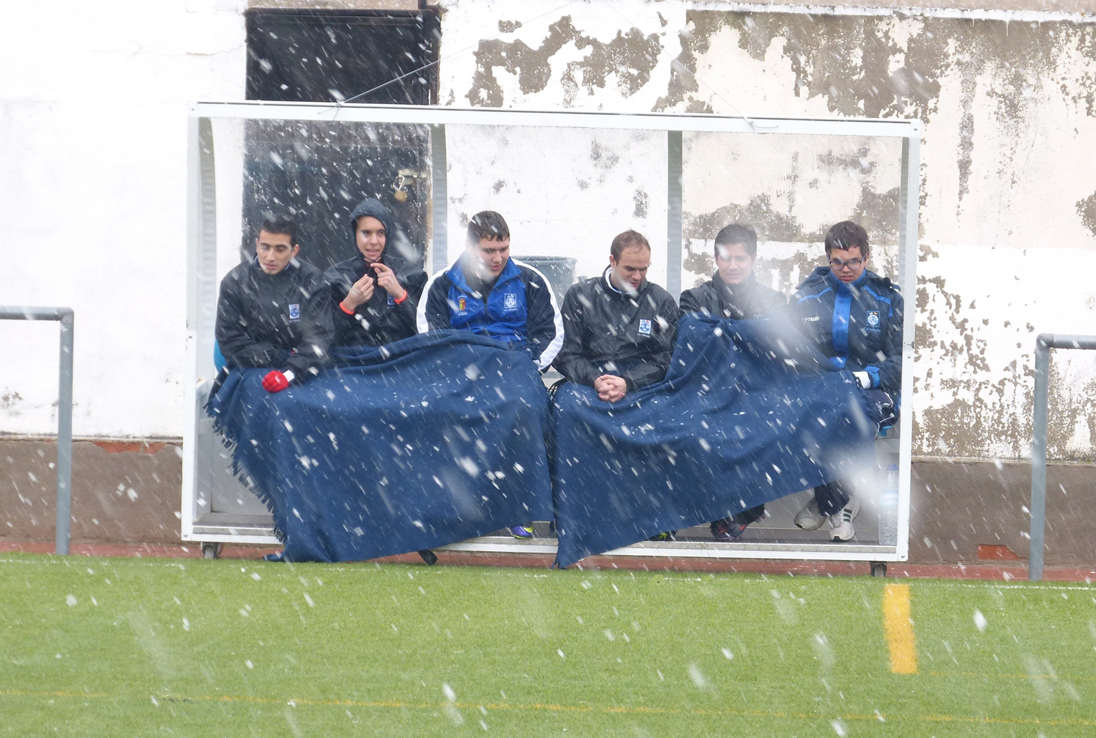 Los jugadores del banquillo combatiendo el frío con mantas