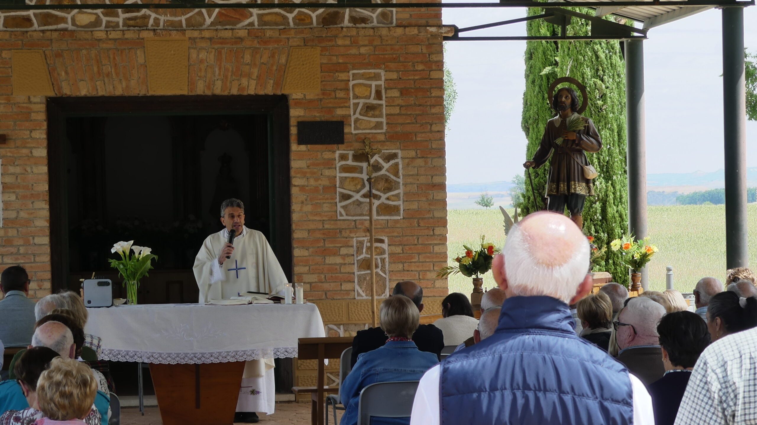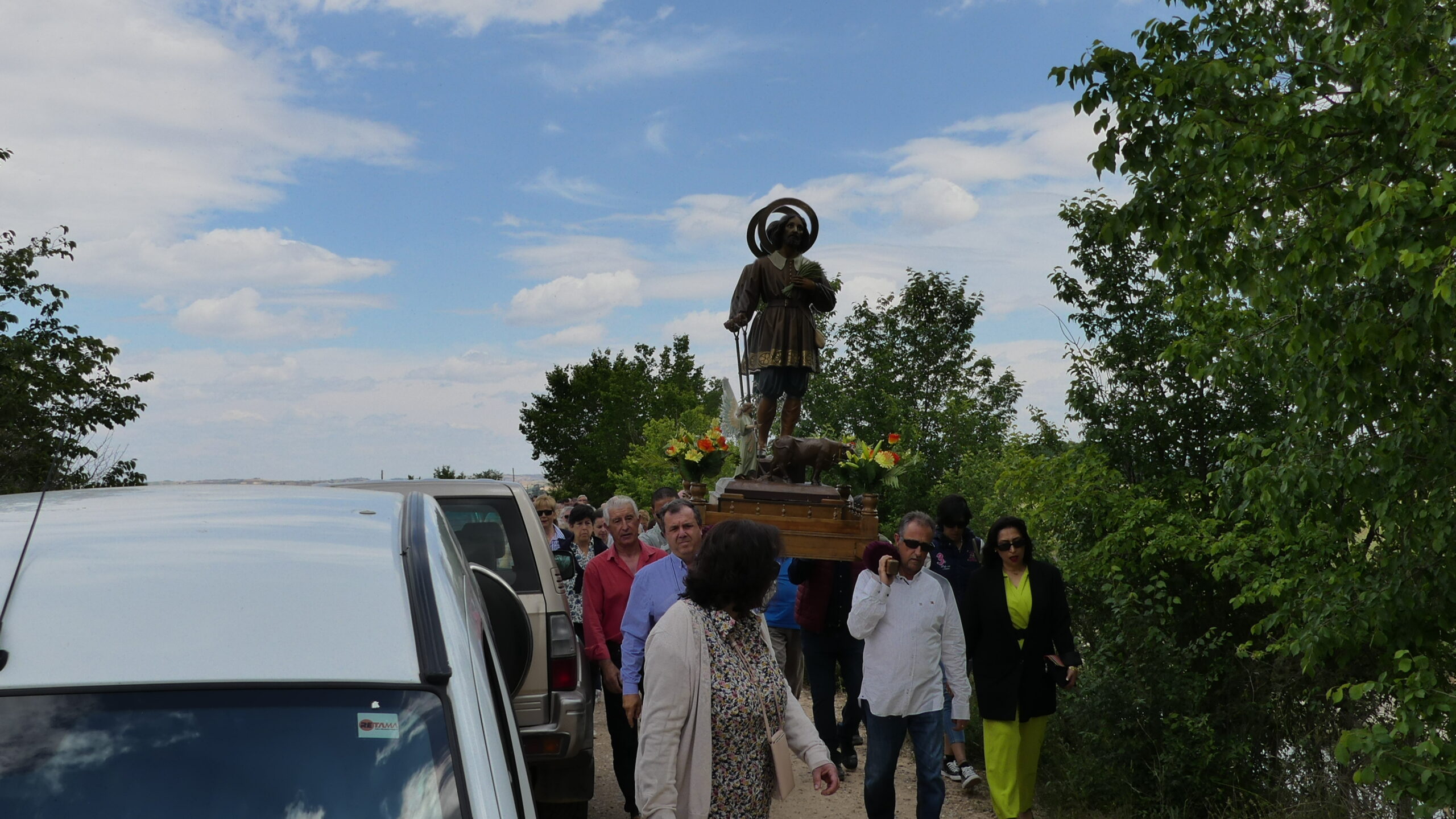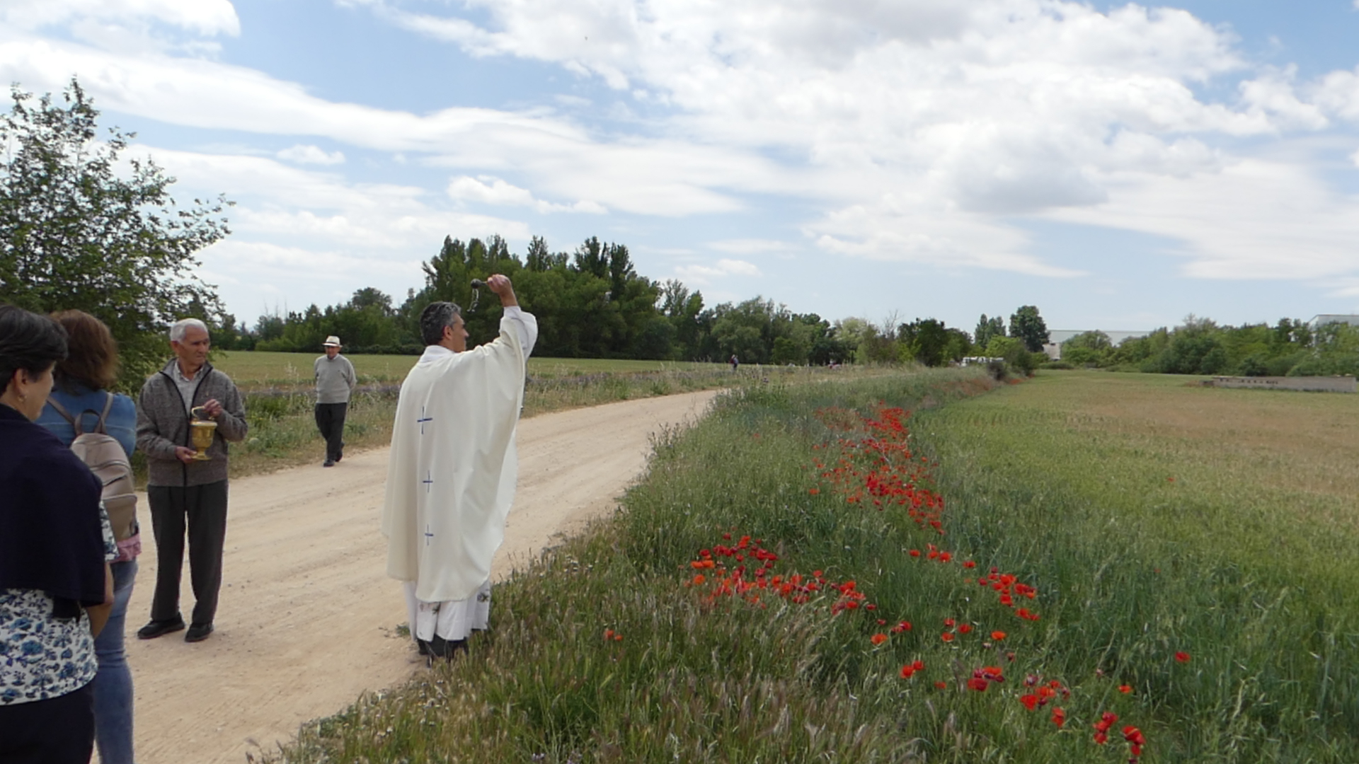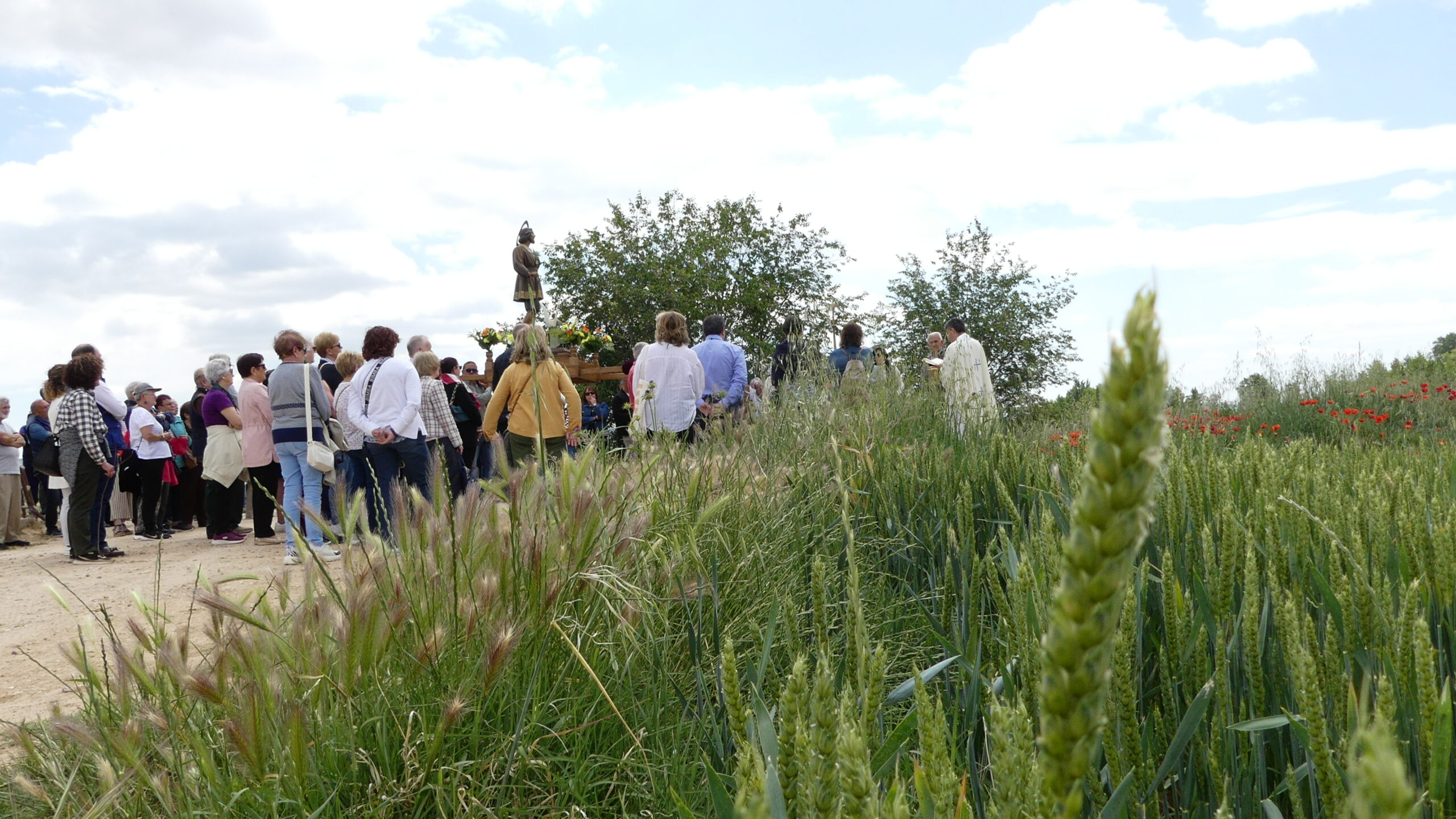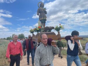 Seguidamente se ha sacado al santo en procesión cargado por los agricultores y vecinos por los alrededores de la ermita. En la confluencia de varias parcelas agrícolas, el párroco ha bendecido los campos y ha pedido agua para mejorar las cosechas del pueblo.