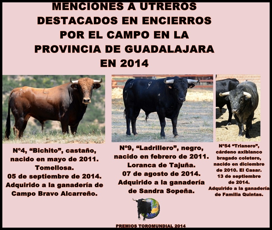 En la categoría de mejor utrero en encierro por el campo en la provincia de Guadalajara el burel nº10 de nombre “Ganchino” adquirido a Campo Bravo Alcarreño y soltado en el encierro por el campo de Yunquera de Henares del 19 de septiembre resultó vencedor con un porcentaje 41,98%, frente al 24,13% que los obtuvo el astado nº 6 de Sandra Sopeña soltado en el encierro por el campo de Loranca de Tajuña el 07 de agosto, 14,94% la res nº4 de Tomellosa adquirida a Campo Bravo Alcarreño y el utrero nº54 del encierro por el campo de El Casar de la Familia Quintas con un 11,49%.