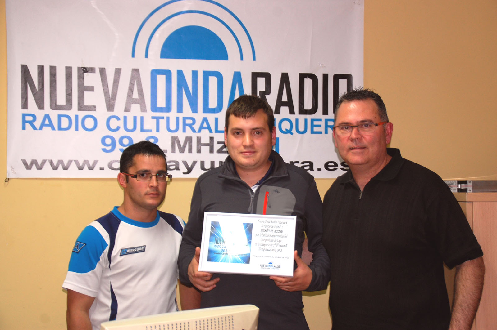 El pasado jueves, 30 de abril, Guillermo Gil Pérez, guardameta del equipo de fútbol 7 del Mesón el Rodeo, en representación de toda la plantilla y a la finalización de una entrevista recibió una placa conmemorativa por parte de Nueva Onda Yunquera de manos de Juan Carlos Ramírez y de JuanMa Palomares directores de la emisora y del programa deportivo “Yunquera en Juego” respectivamente.