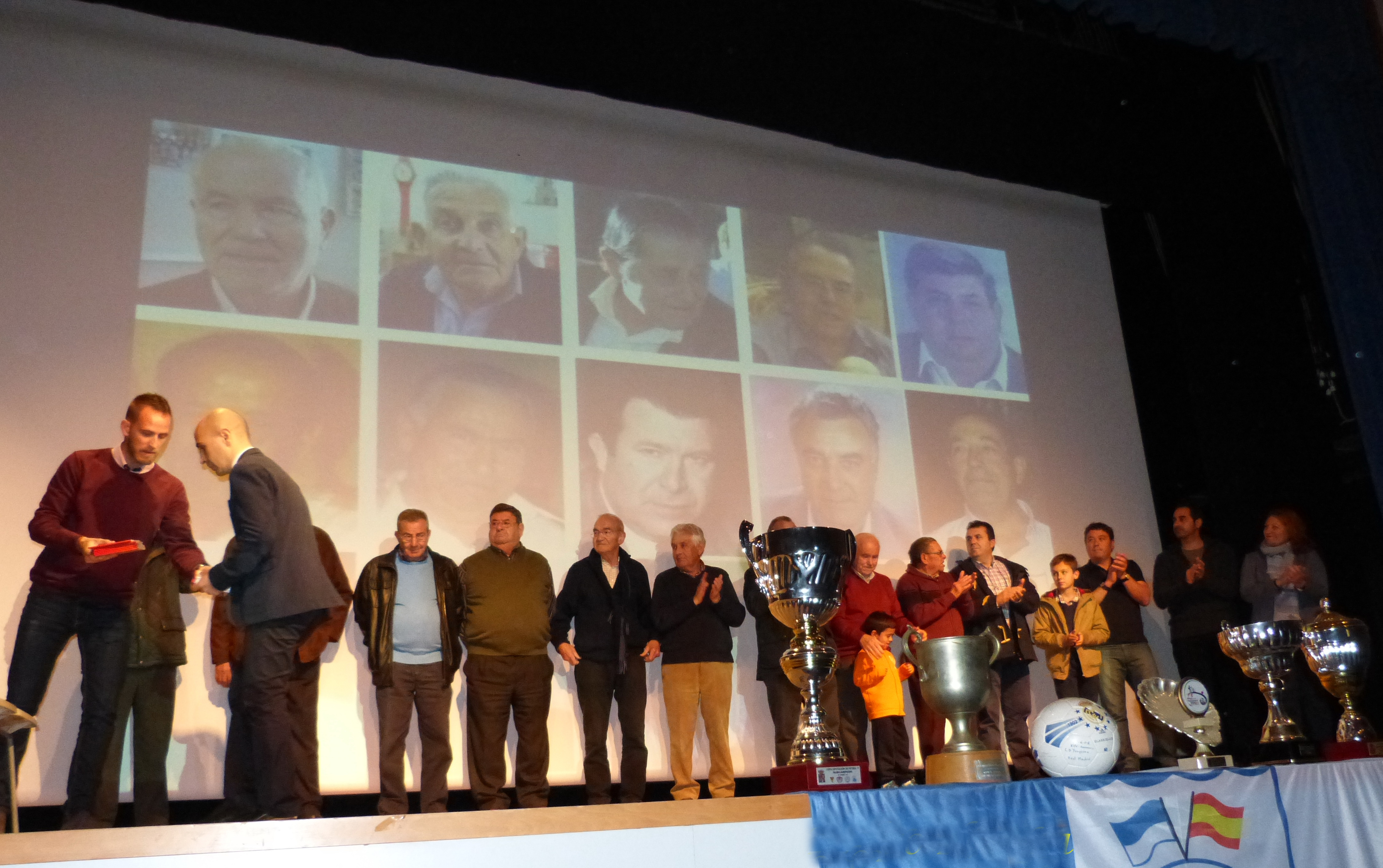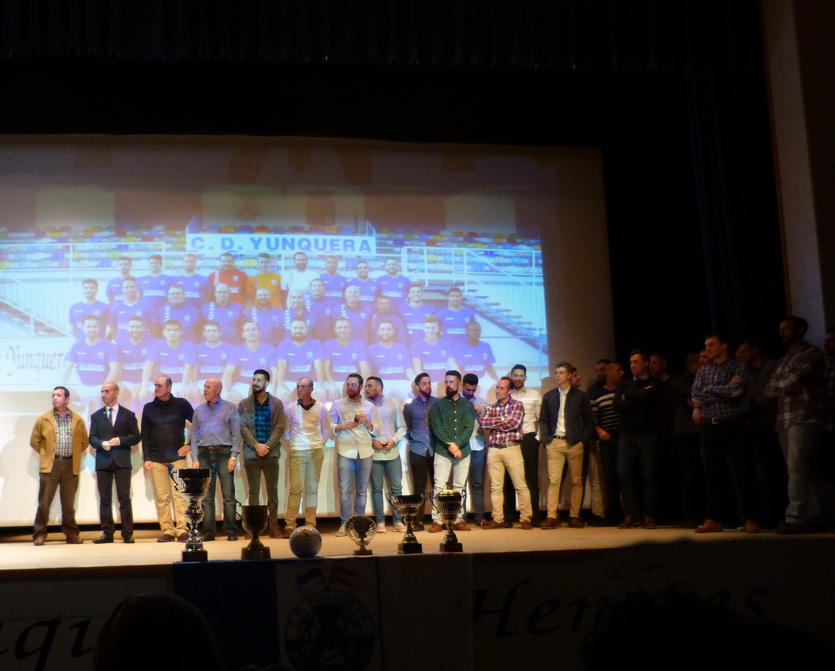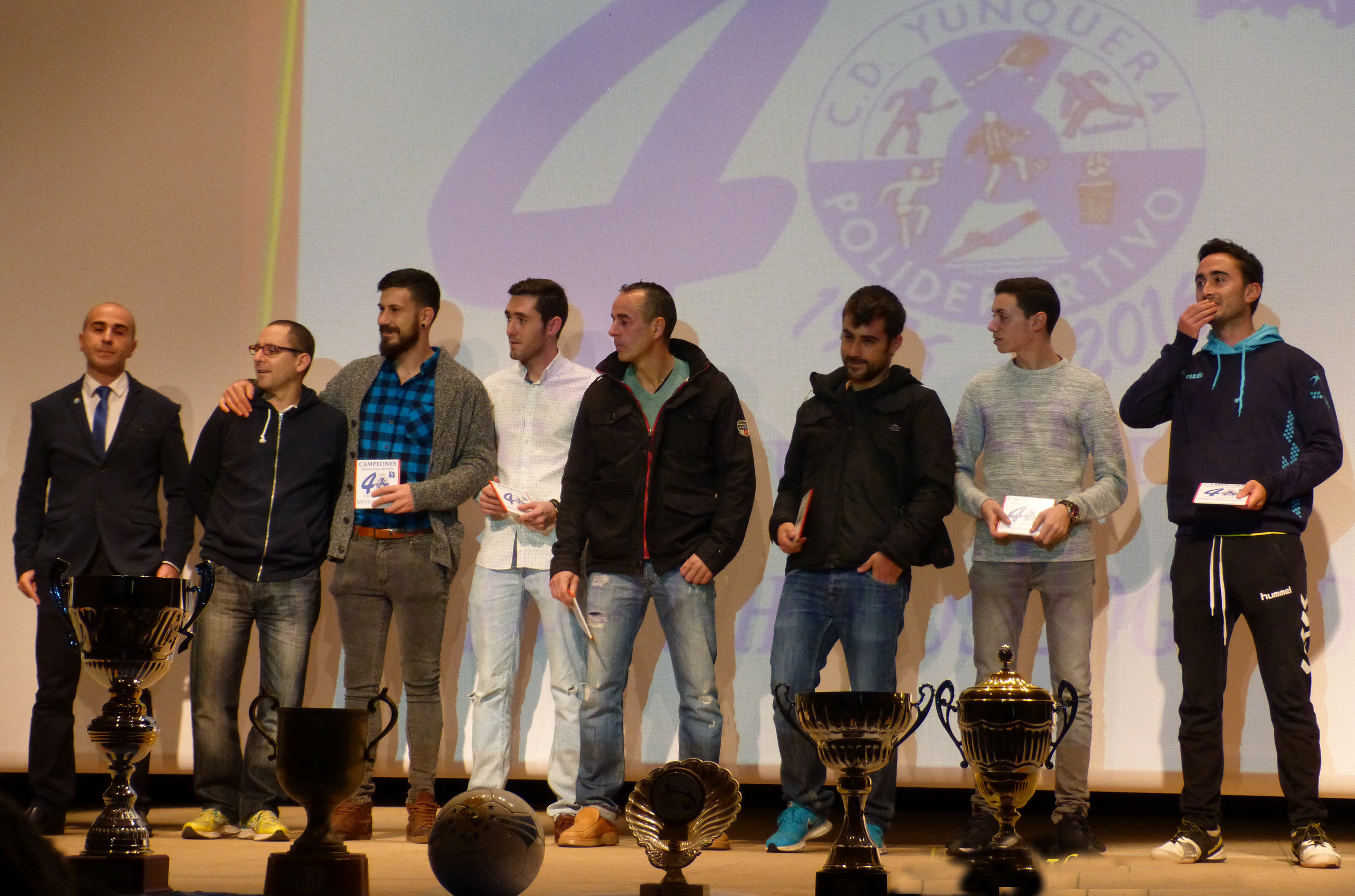 El final del acto llegaba con el momento tan esperado cuando los miembros de aquella junta directiva fundadora eran invitados a subir al escenario, uno a uno: Juan Taracena Notario, Ángel Verguizas Martínez, Mariano Bravo León, Antonio Molina Sánchez, Nicolás Pimentel Puerta, Gonzalo Ramírez Molina, Ángel Notario Sancho, Juan Olías Gordo, Benito García Daza, y familiares de los ya fallecidos Manuel Abad Estremera, José Luis Gutiérrez Fuentes, Julio Pérez Estremera, Guillermo León Molina y Rufino Pérez García, se acercaron hasta el para recibir el cariñoso aplauso del público asistente y un detalle conmemorativo de manos del presidente del C.D.Yunquera, Antonio Navarro Juárez y del Vicepresidente, Javier Robledo Pozuelo. Dieron las gracias en nombre de todos María Antonia Pérez León en representación de su padre Rufino Pérez García y Juan Olías Gordo, destacando ambos la dura labor que todos los componentes llevaron a cabo allá por 1976 para fundar el club sin apenas medios materiales ni económicos.