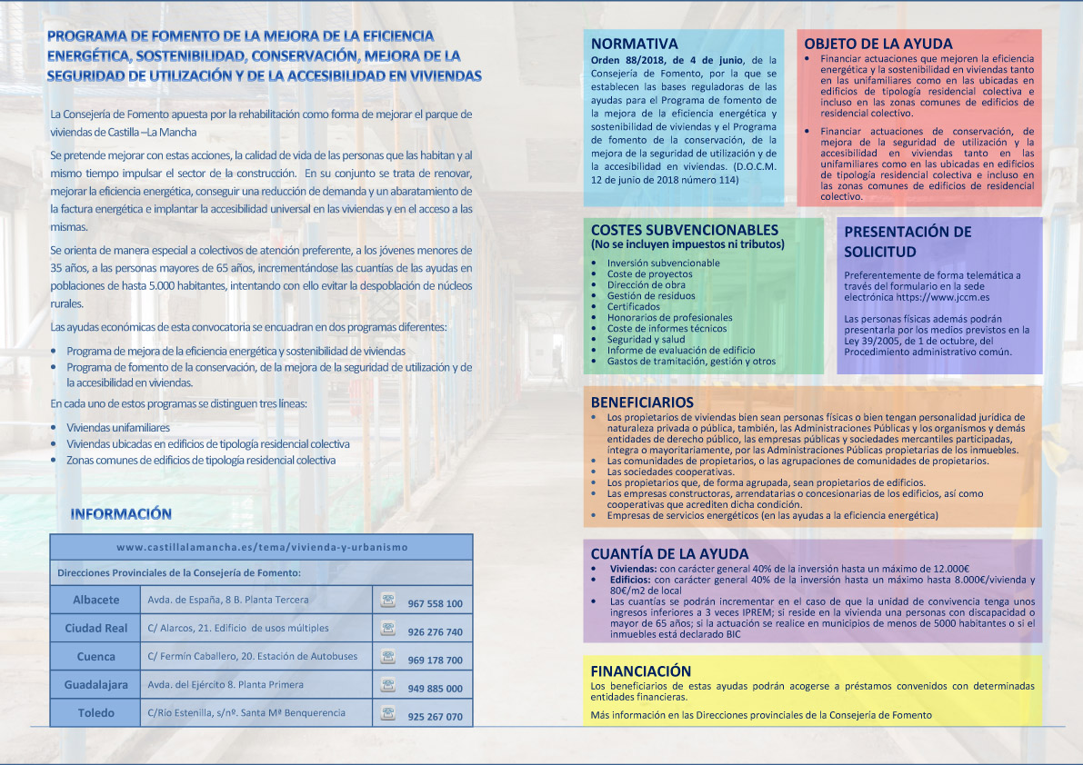 Con fecha 8 de agosto de 2018 se publicó en el D.O.C.M. la Resolución de 01/08/2018, de la Dirección General de Vivienda y Urbanismo, por la que se convocan ayudas reguladas en la Orden 88/2018, de 4 de junio, de la Consejería de Fomento para la rehabilitación de viviendas unifamiliares y viviendas ubicadas en edificios de tipología residencial de vivienda colectiva, en el Programa de fomento de la mejora de la eficiencia energética y sostenibilidad de viviendas y en el Programa de fomento de la conservación de la mejora de la seguridad de utilización y de la accesibilidad en viviendas. Con ello se está apostando por la rehabilitación como forma de recuperar un gran parque de viviendas infrautilizado, mejorar la calidad de vida de las personas que las habitan, optimizar la eficiencia energética de las viviendas y a la vez impulsar el sector de la construcción a través de las actuaciones de rehabilitación de ese parque de viviendas.