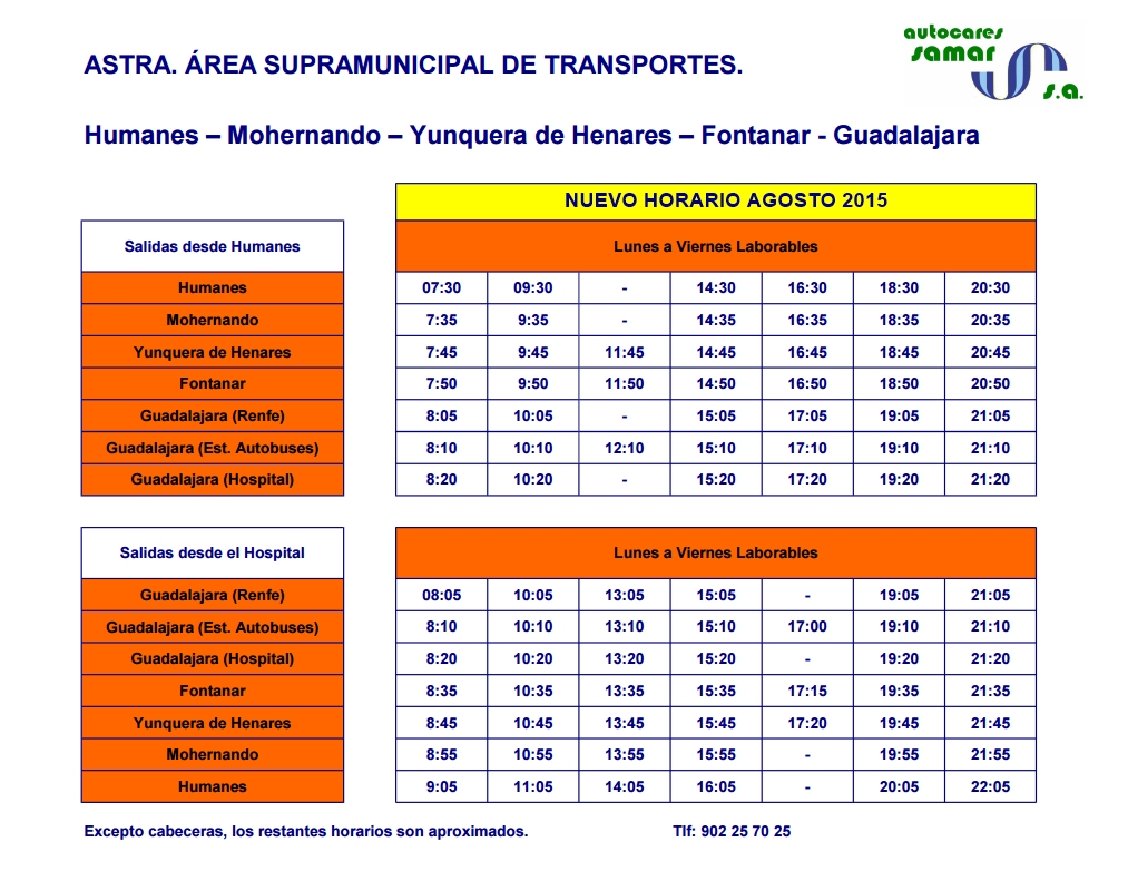 Según informa la Concejalía-Delegada de Transportes del Ayuntamiento de Yunquera de Henares, Doña Esther Gutierrez Machuca, la empresa SAMAR que cubre la línea Guadalajara-Humanes, ha modificado como en años anteriores la frecuencia de autobuses para el mes de agosto.