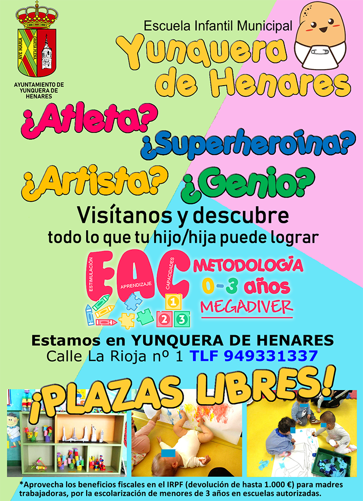 La Escuela Infantil Municipal de Yunquera de Henares tiene todavía plazas libres para el presente curso escolar 2019/2020.