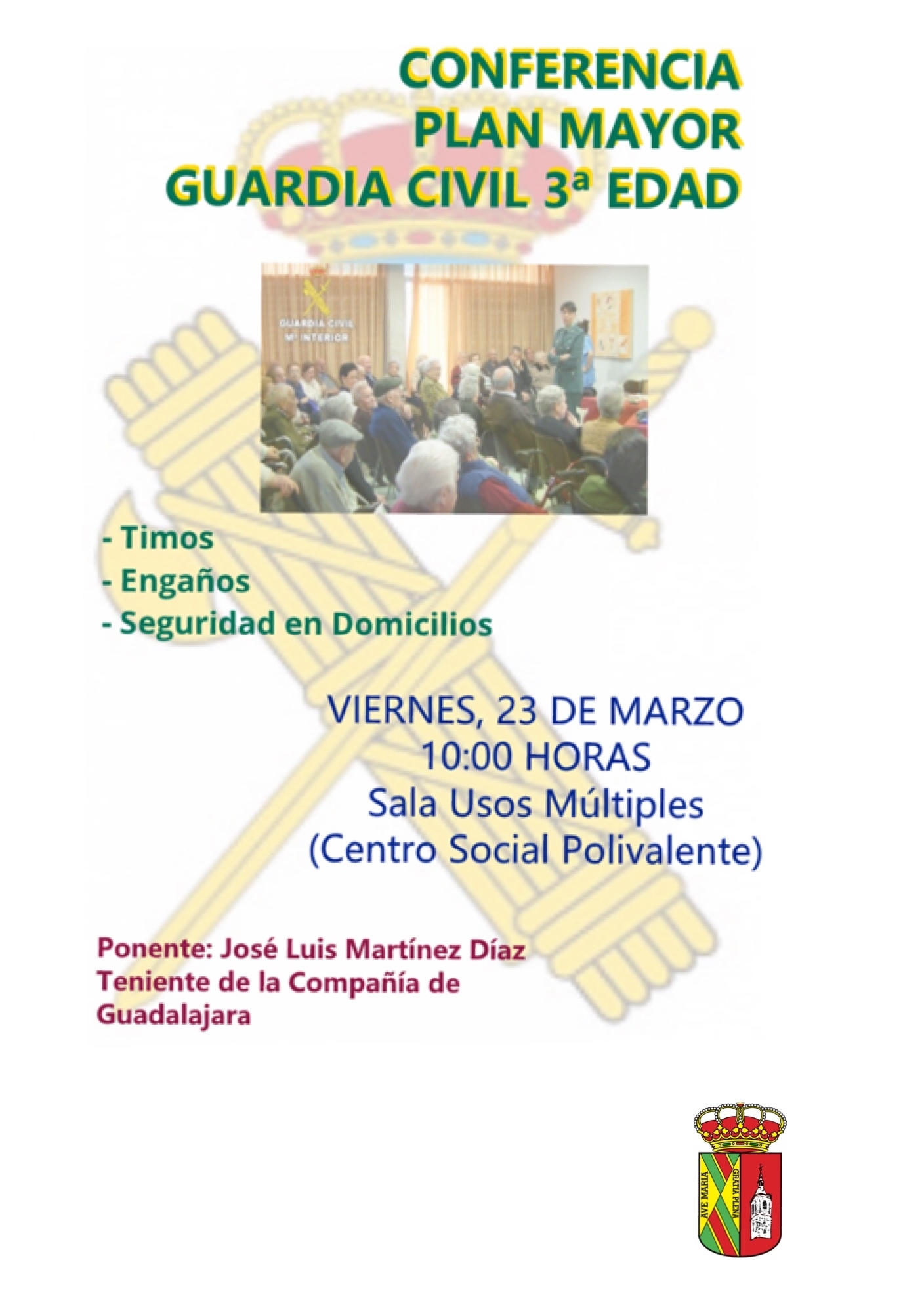 El encargado de impartir la charlas será el Teniente de la Compañía de Guadalajara, José Luis Martínez Díaz. En la intervención se les dará a los mayores distintas pautas para evitar robos en domicilios, hurtos en entidades financieras, tirones, estafas, uso fraudulento de sus propiedades, maltrato en sus diferentes formas así como medidas preventivas en relación con los riesgos derivados del uso de internet y las nuevas tecnologías.