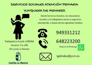 Los Servicios Sociales de Atención Primaria en Yunquera de Henares, siguen atendiendo. les dejamos la información en el el siguiente aviso, para aquellos ciudadanos que quieran contar con ellos.