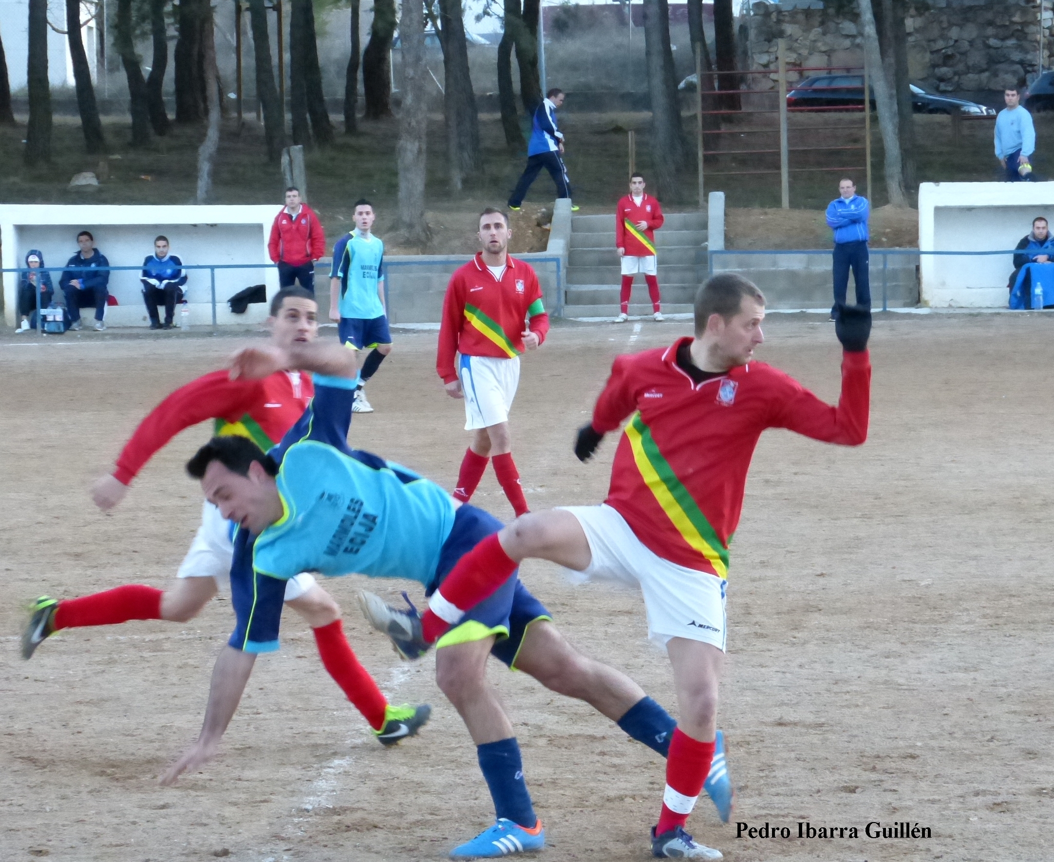 Una de las jugadas más bonitas del partido se produjo en el minuto 18 cuando los campiñeros botaron una falta por medio de Sergio casi desde el córner hacia la frontal del área y David Robledo que venía en carrera dejaba pasar para que Héctor que venia desde atrás libre de marca golpeara el balón con el interior y este salía rozando el poste.