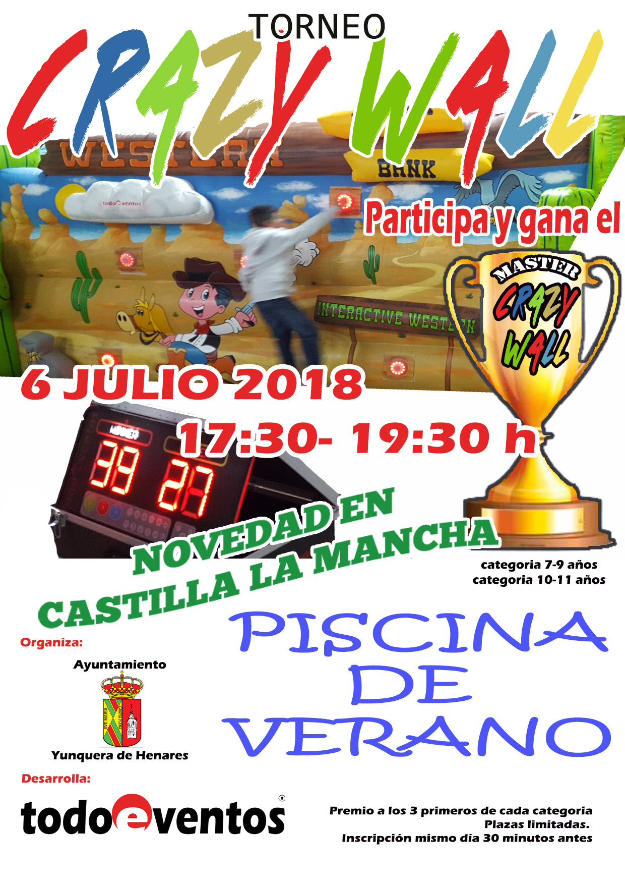 Para los mas jovencit@s que esten en la piscina. El viernes día 6 de julio, de: 17:30 a 19:30 «Torneo CRAZY WALL», nuevo en Castilla La Mancha, dos categorias de participación: de 7 a 9 años y de 10 a 11, ¡¡la diversión esta servida!! ¡¡acude a la piscina el día 6!!
